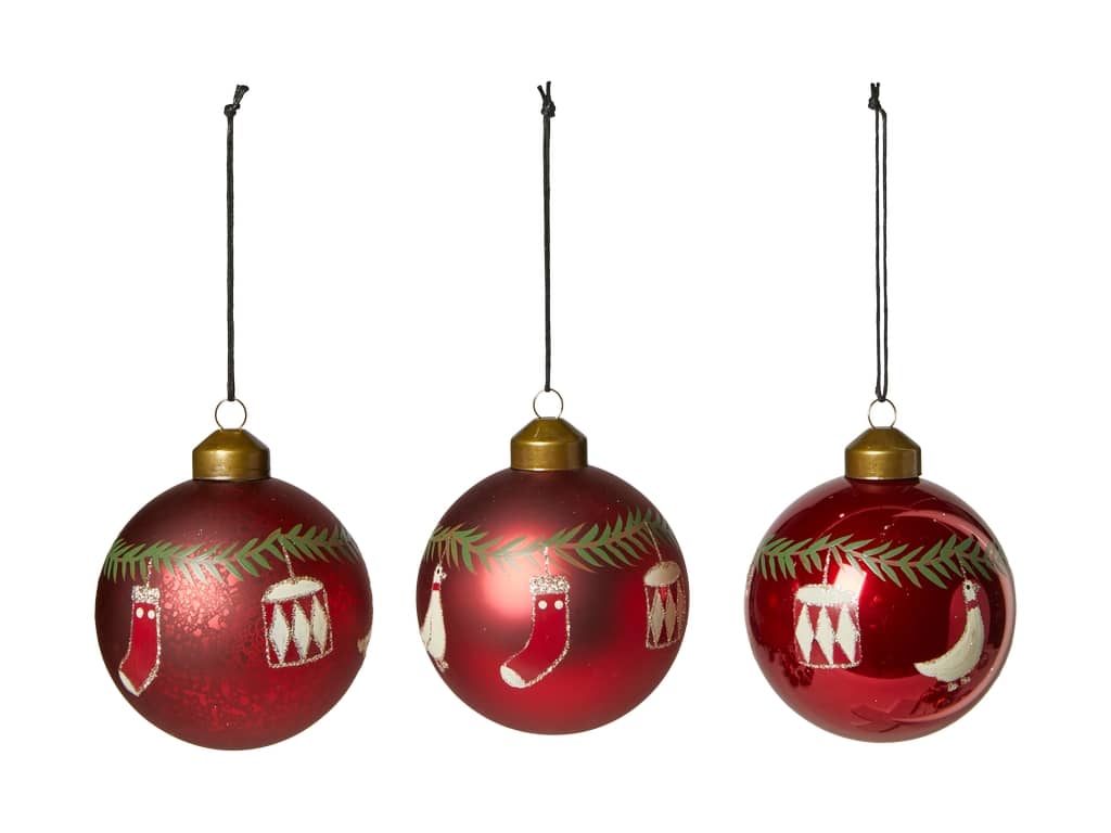 Klassiske julekugler med granguirlande og julemotiver såsom gås, tromme og julesok. Julekuglerne fås i mat rød, blank rød og mat rød med krakeleret overflade. Meget flotte på juletræet eller som bordpynt, hvor de passer med motiverne fra dugene også fra S