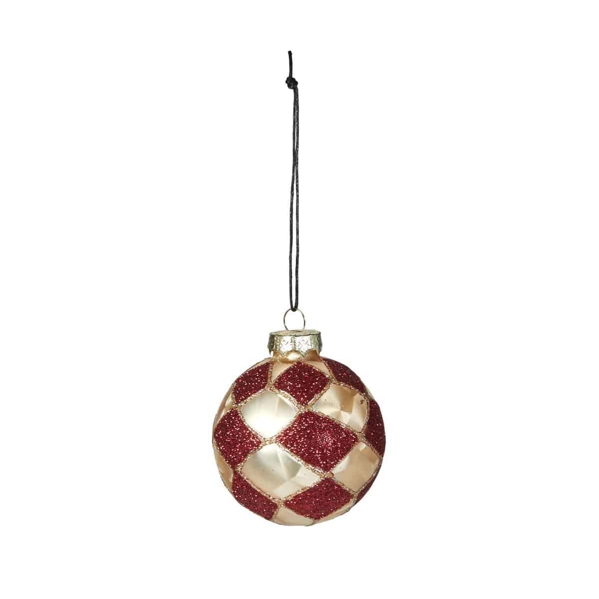 Mønstret julekugle i glas fra Speedtsberg i afdæmpede nuancer af champagne og mørkerød. De mørkerøde felter er med glitteroverflade, der giver en flot struktur. Julekuglen er oplagt som pynt på juletræets grene, men kan også pynte smukt på julebordet elle