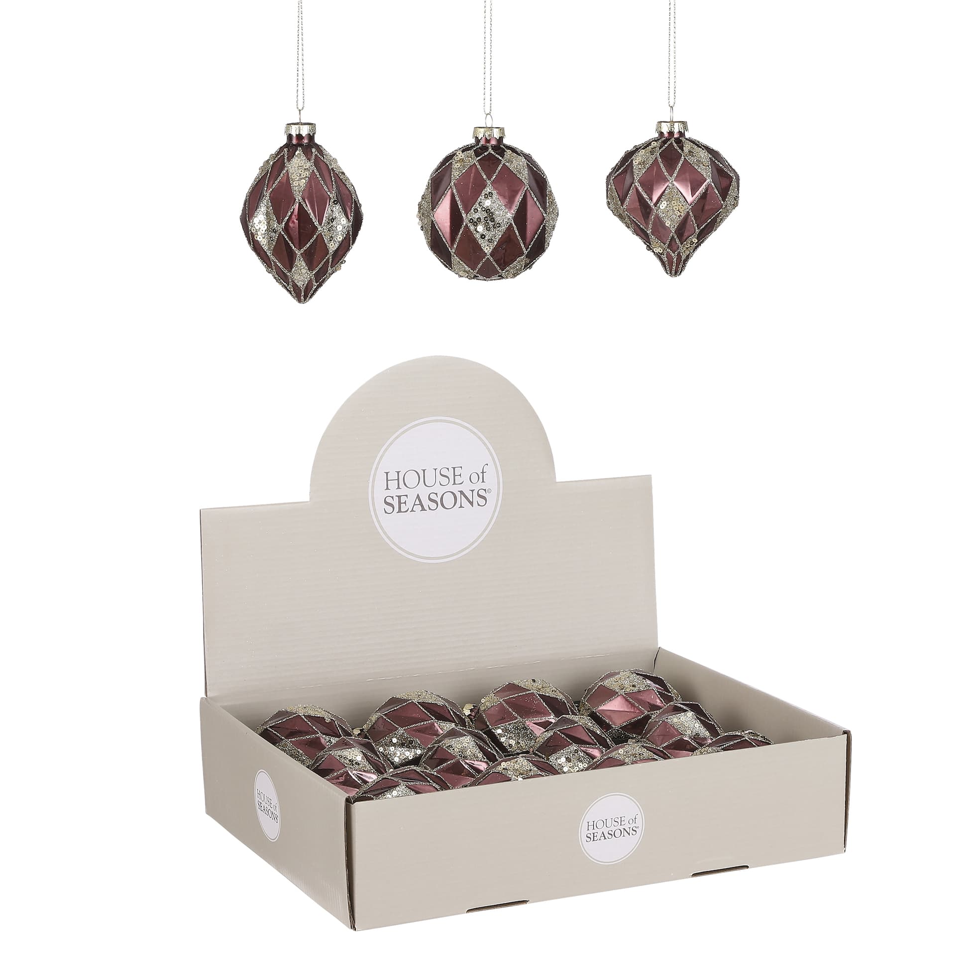 Julekugle med rudemønster i mørkerød og guldfarvet. Fremstillet i ægte glas. Faconen gør at lyset reflekterer på en meget flot måde. Julekuglerne har en ca. diameter på 8 cm, hvor de er bredest.Pakket med 1 stk.