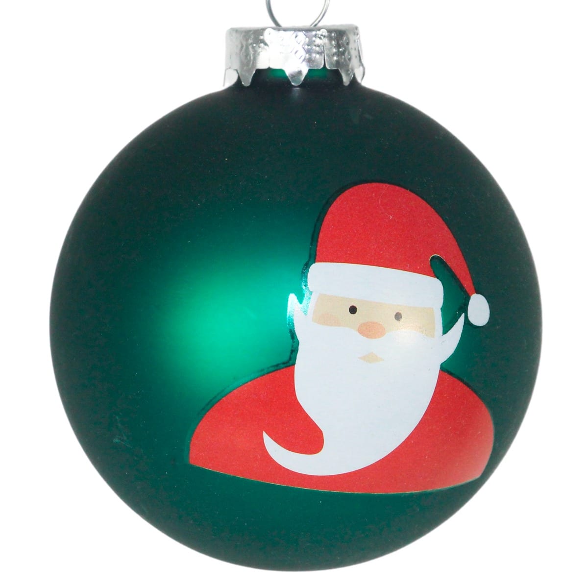 Julekugle i glas. Julekuglen er mat mørkegrøn med Julemanden som motiv. Måler 8 cm i diameter. Pakket med 1 stk.