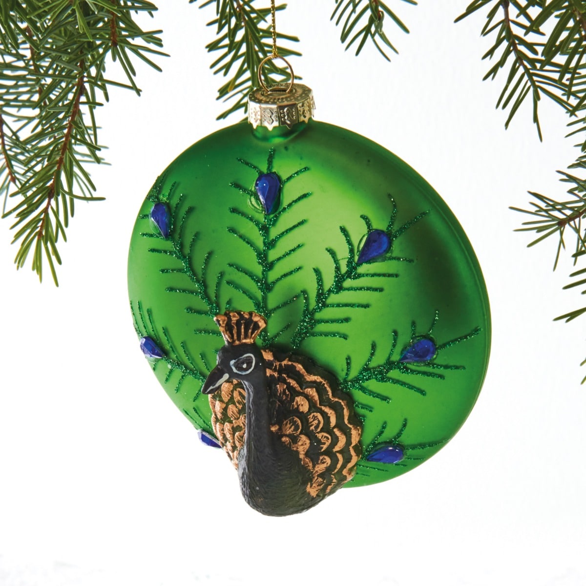 Påfugl med udslået, rund hale malet på flad, rund julekugle. Foran titter det lille påfuglehoved frem. Meget flot i farverne. Mål:Højde: 10 cmFremstillet i glas.Pakket med 1 stk