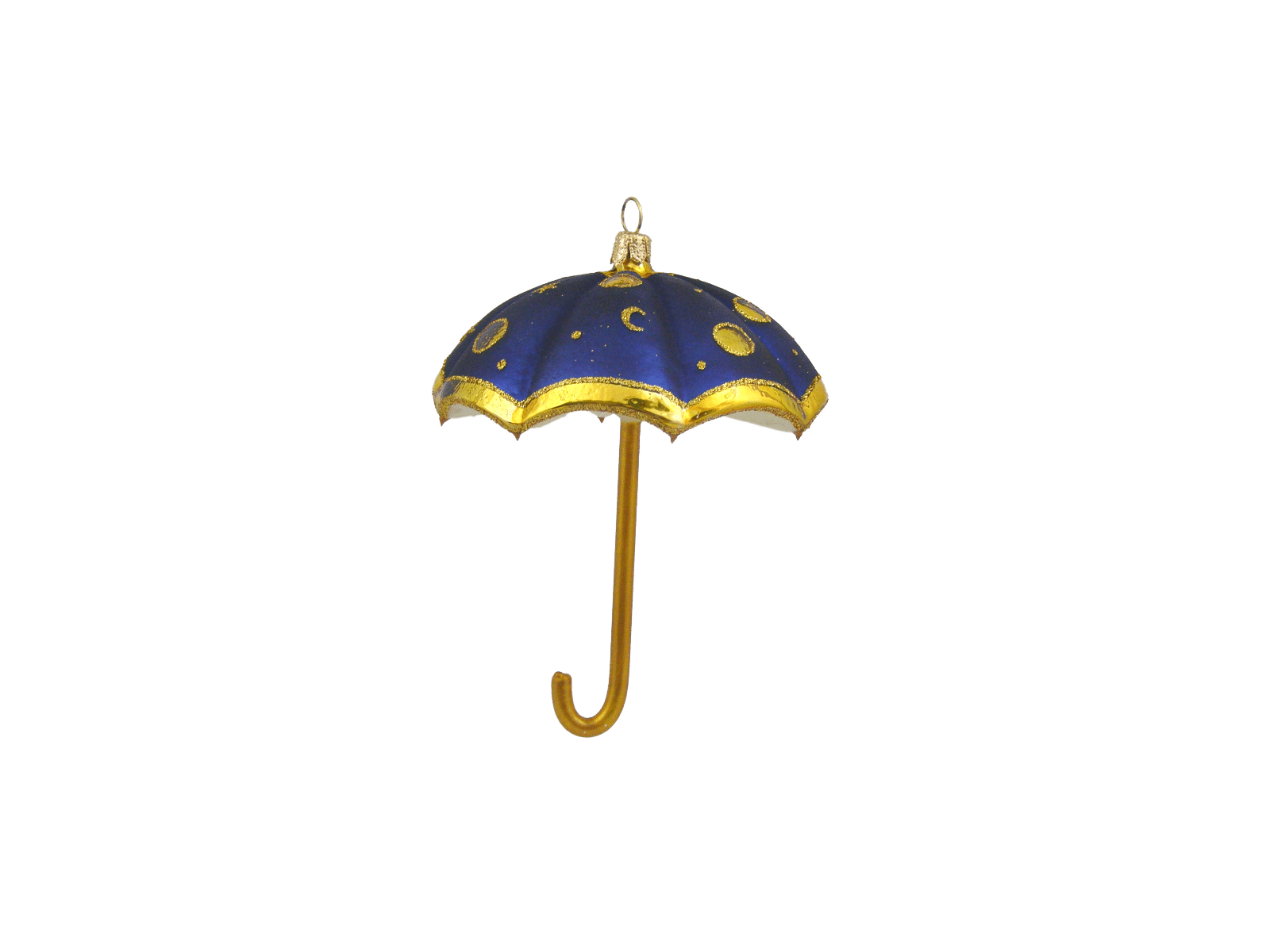 Detaljerig julekugle, der forestiller en parasol med natblå himmel med sol, måne og stjerner. Julekuglen er mundblæst og håndmalet hos det østrigske glaspusteri Hanco. Figurkugler på grene og juletræer er skønne blikfang mellem de klassiske julekugler.Mål