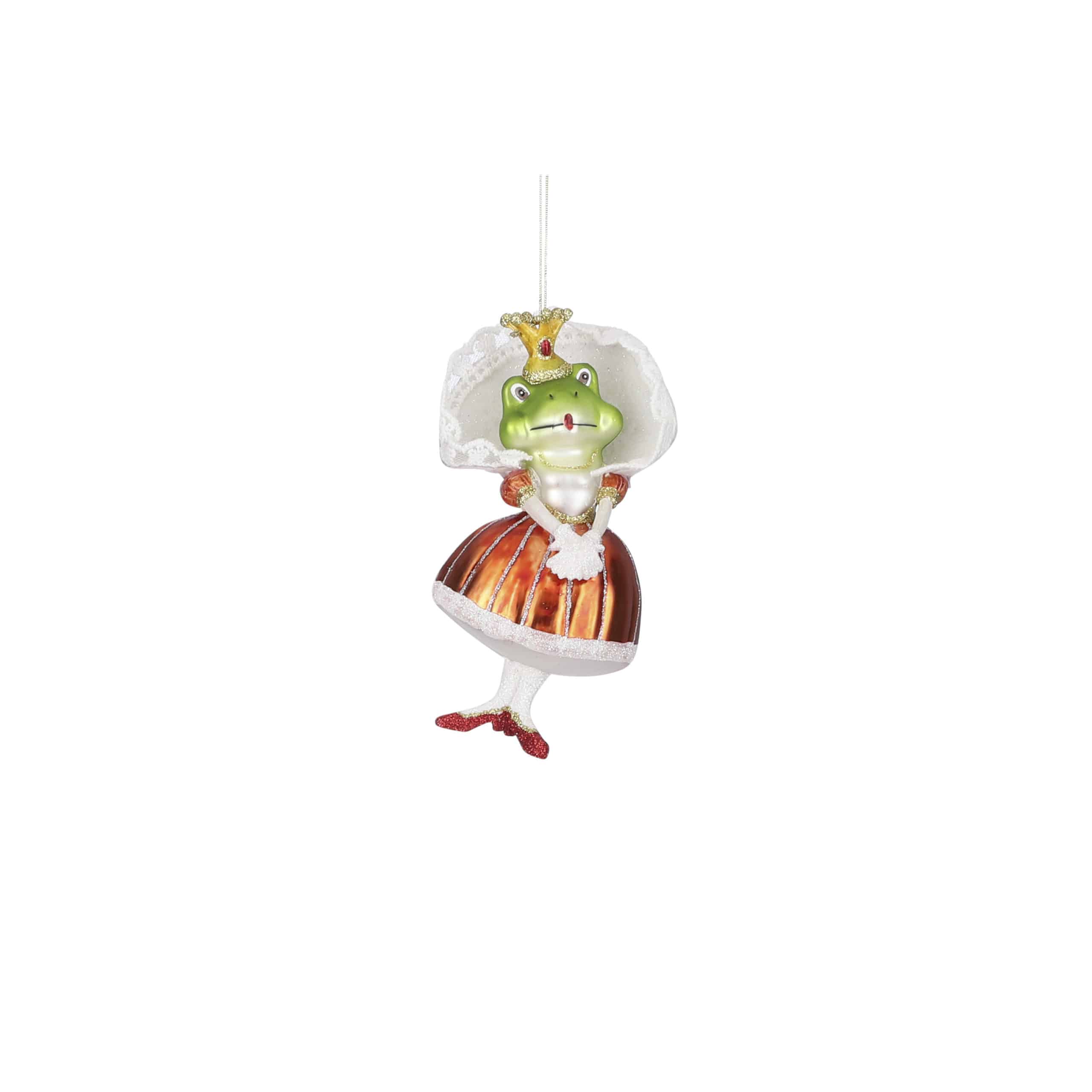 Julekugle Prinsessefrø med fin kjole, sko og krone. Figurkugler liver juletræet op med deres finurlige væsener. Mål:Højde: 14 cmFremstillet af glas.Pakket med 1 stk.