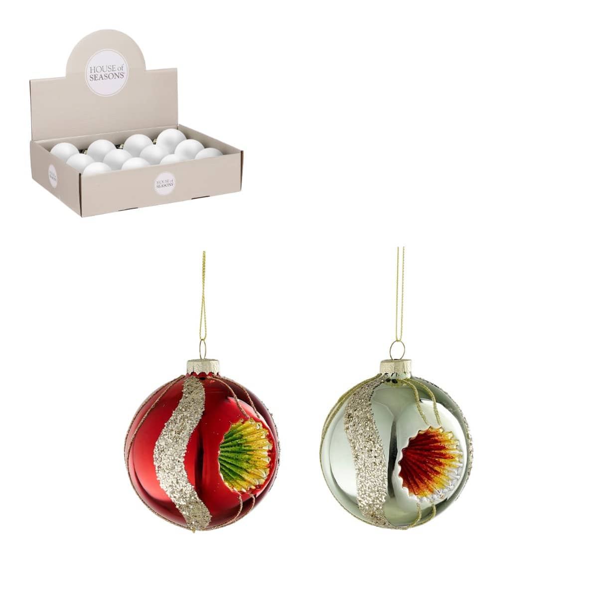 Refleksjulekugler i rød eller mintgrøn med bølgende, glimmerstriber af forskellig tykkelse. I midten af julekuglen er der et hul med rillet mønster og flotte farver. Reflekterer lyset meget fint. Mål:Diameter: 8 cmFremstillet af glas.Pakket med 1 stk.