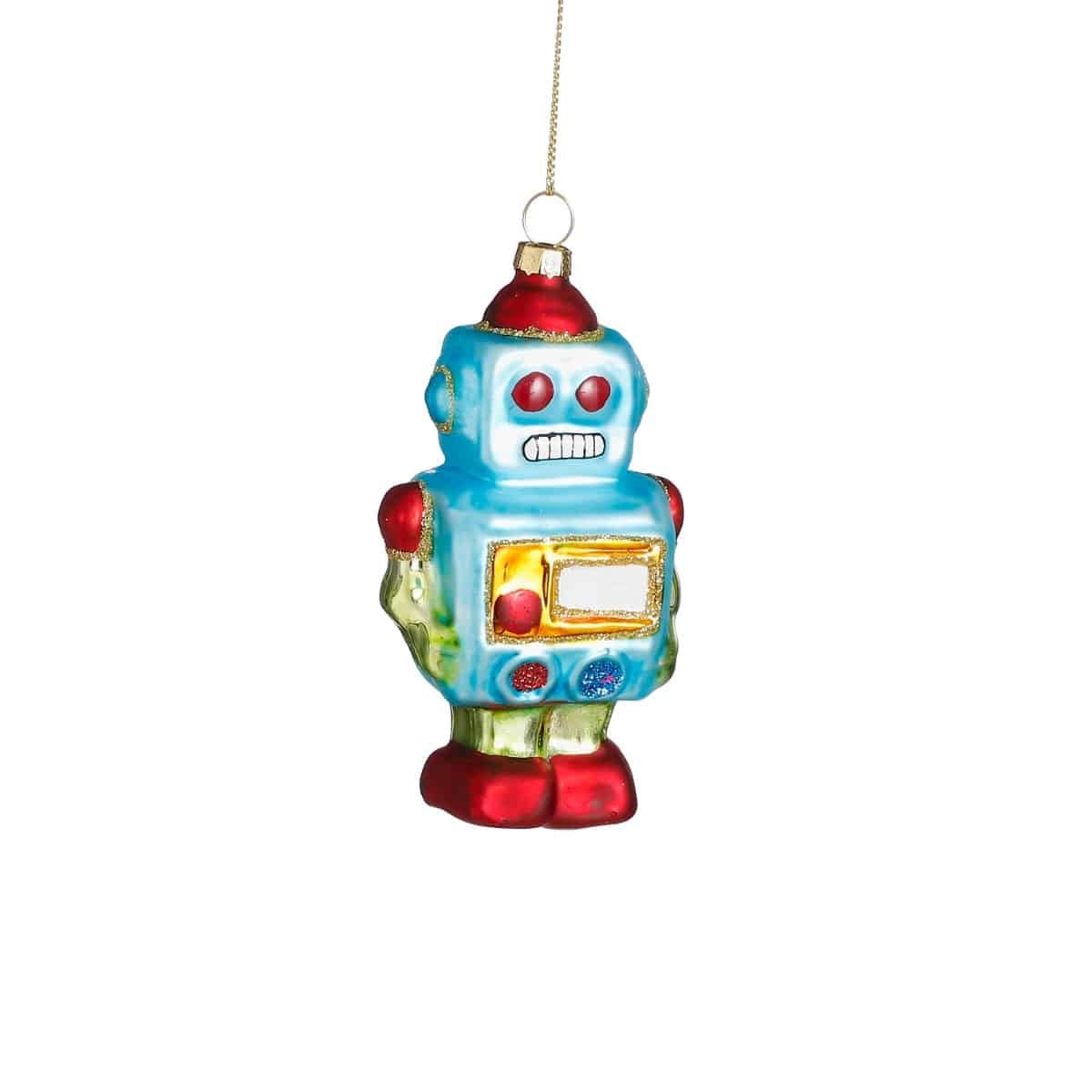 Julekugle formet som en robot med røde sko. Robotten er med snor til ophængning. Pynt juletræet med forskellige, farverige og festlige figurer. Mål:Længde: 6 cmBredde: 4 cmHøjde: 12 cmFremstillet i glas.Pakket med 1 stk.