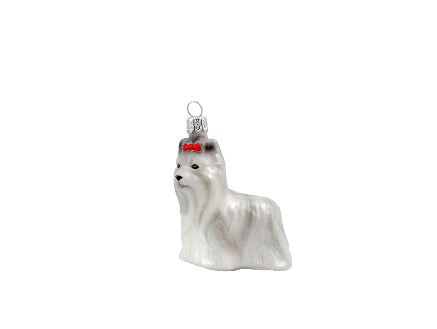 Julekugle Shih Tzu hund er fremstillet i ægte glas fra et østrigsk glaspusteri ved navn Hanco. Stående Shih Tzu hund med langhåret pels og rød sløjfe på hovedet. Hunden måler 7,7 cm i højden.Pakket med 1 stk.