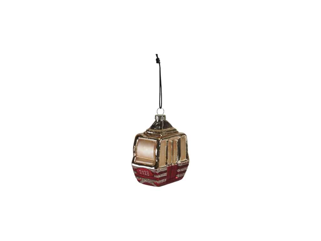 Julekugle formet som en skiliftskabine i rød og guldfarvet. Figurkugler er flotte blikfang på juletræet. Mål:Længde: 8 cmBredde: 5 cmHøjde: 10,5 cmFremstillet af glas.Pakket med 1 stk.