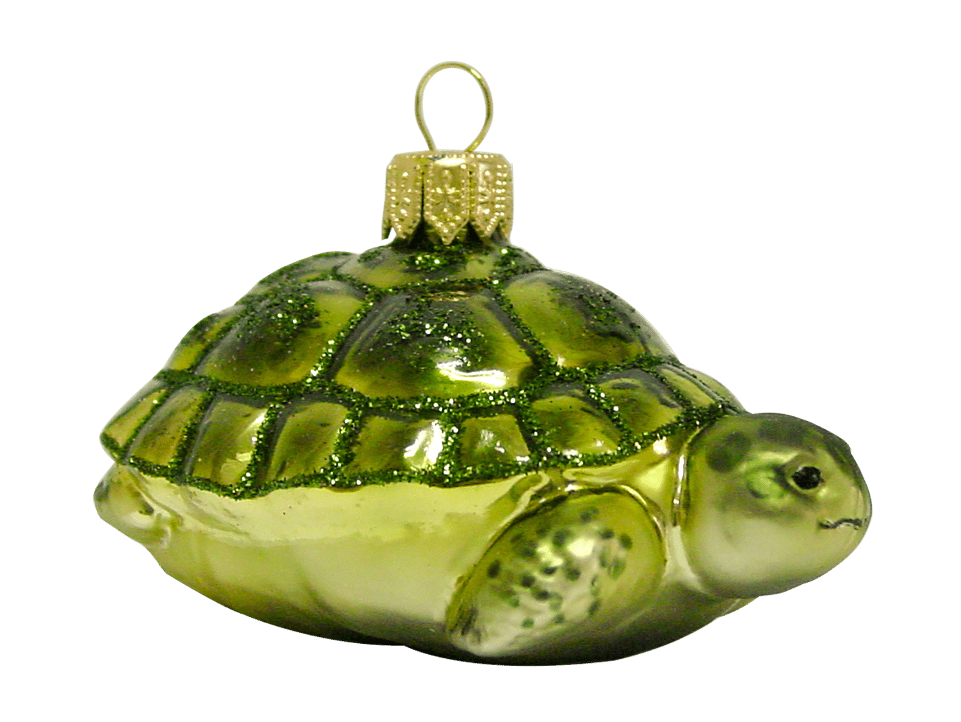 Detaljerig julekugle, der forestiller en skildpadde i flot grøn farve med grønt glimmer på skjoldet. Julekuglen er mundblæst og håndmalet hos det østrigske glaspusteri Hanco. Figurkugler på grene og juletræer er skønne blikfang mellem de klassiske julekug