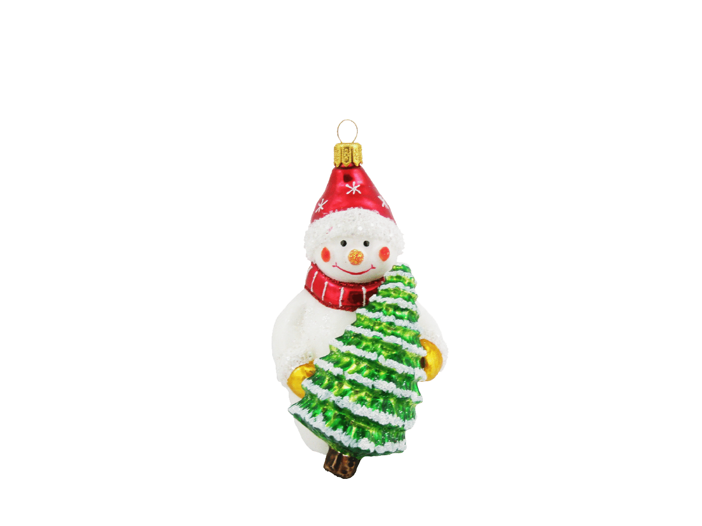 Julekugle Snemand med juletræ er fremstillet i ægte glas fra et østrigsk glaspusteri ved navn Hanco. Den glade snemand står med det nyfællede juletræ. Snemanden har rødt halstørklæde med hvide striber på og rød hue med hvid kant. Snemanden måler 11,5 cm i