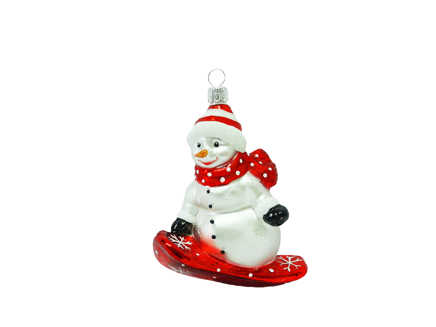 Julekugle Snemand på snowboard er fremstillet i ægte glas fra et østrigsk glaspusteri ved navn Hanco. Snemanden er i fuld fart på det røde snowboard med de hvide snefnug. Snemanden har iklædt sig rødt halstørklæde med hvide prikker og en rød og hvid strib