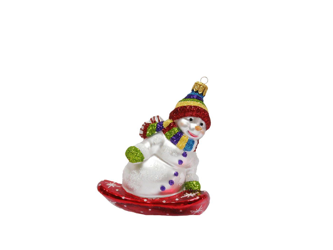 Detaljerig julekugle, der forestiller en snemand. Snemanden er hoppet på det røde snowboard. Han har pakket sig varmt ind med farvestrålende, glimmerstribet hue og halstørklæde. Julekuglen er mundblæst og håndmalet hos det østrigske glaspusteri Hanco. Fig