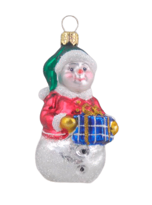 Detaljerig julekugle, der forestiller en snemandsdame med en blå pakke. Julekuglen er mundblæst og håndmalet hos det østrigske glaspusteri Hanco. Figurkugler på grene og juletræer er skønne blikfang mellem de klassiske julekugler.Mål:Diameter: ca. 3,5 cmH