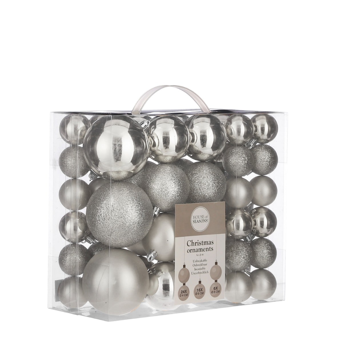 Julekugler sølv 46-pak. Dette er et sæt bestående af 6 varianter af smukke julekugler i en smuk sølvfarve i 3 forskellige størrelser med en diameter op til 8 cm. Fremstillet i plastik.Pakket med 46 stk.