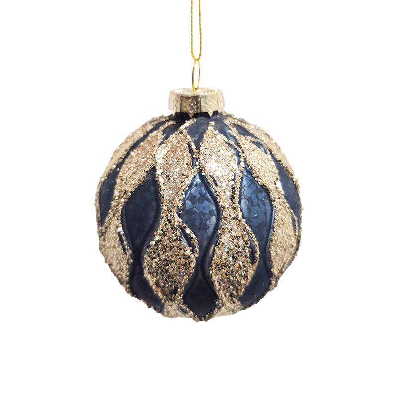 Julekugle Sort med mønster i sølvfarvet. Julekuglerne er med tydelig struktur i glasset og forskellige mønstre. De måler 8 cm i diameter.Pakket med 1 stk.