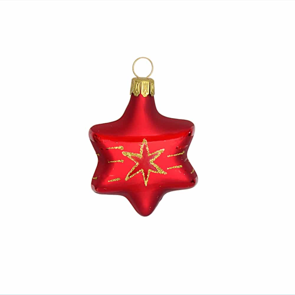 De røde glaskuglestjerner er med guldfarvet stjernemønster. Julekuglerne er mundblæste og håndmalede hos det sydtyske glaspusteri Thüringer Weinachten. Figurkugler på grene og juletræer er skønne blikfang mellem de klassiske julekugler.Mål:Højde: 6,5 cmFr