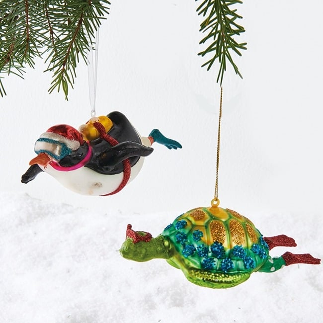 Tilføj humor og charme til juletræet med en figurformet julekugle i glas. Hver julekugle er rigt dekoreret med glimmer og fine detaljer, som fanger lyset så fint. Vælg mellem en pingvin med svømmefødder eller en farverig skildpadde. Begge figurer er fulde