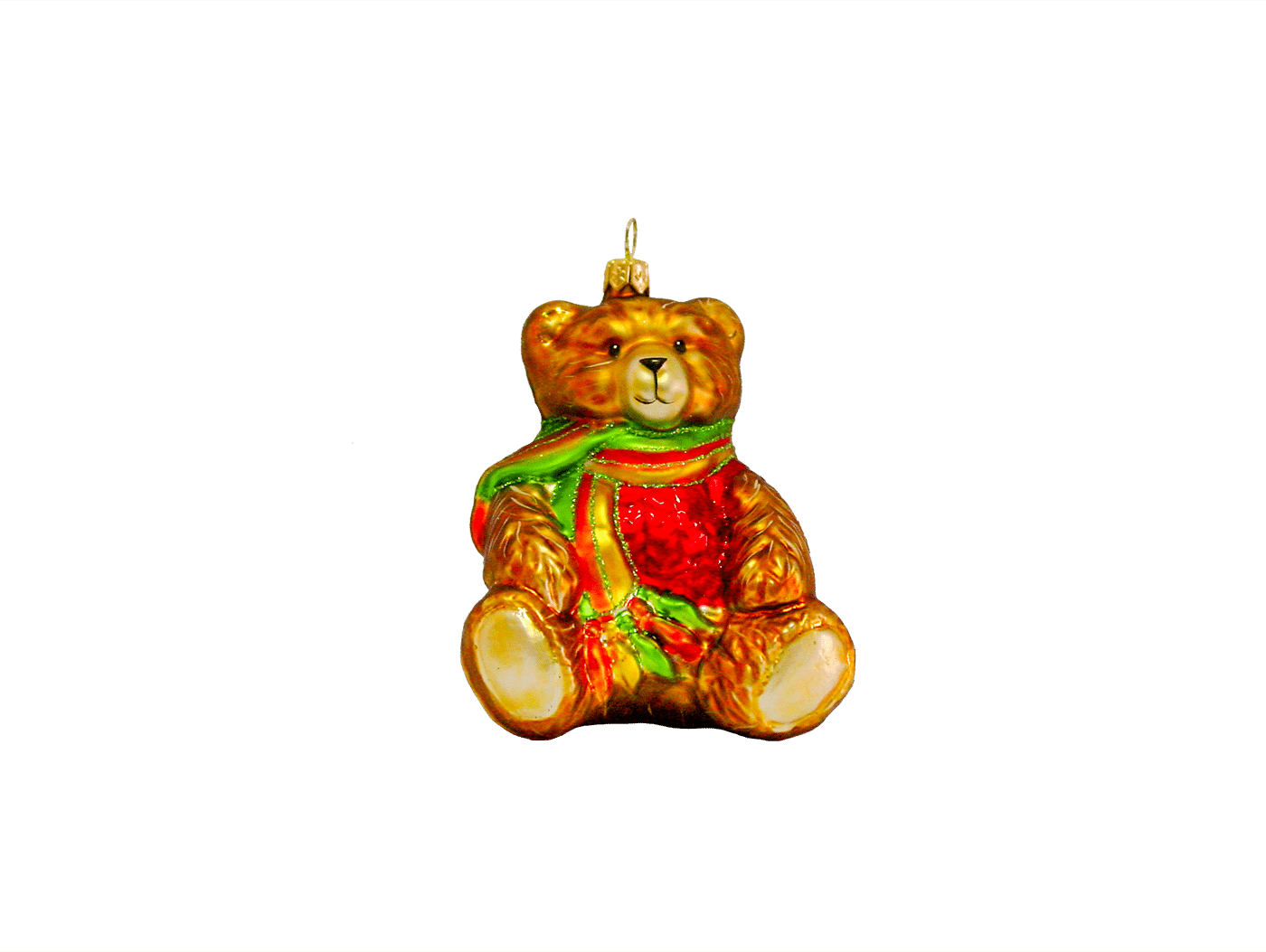 Detaljerig julekugle, der forestiller en sød teddybjørn i gylden nuance med stort halstørklæde. Julekuglen er mundblæst og håndmalet hos det østrigske glaspusteri Hanco. Figurkugler på grene og juletræer er skønne blikfang mellem de klassiske julekugler.M