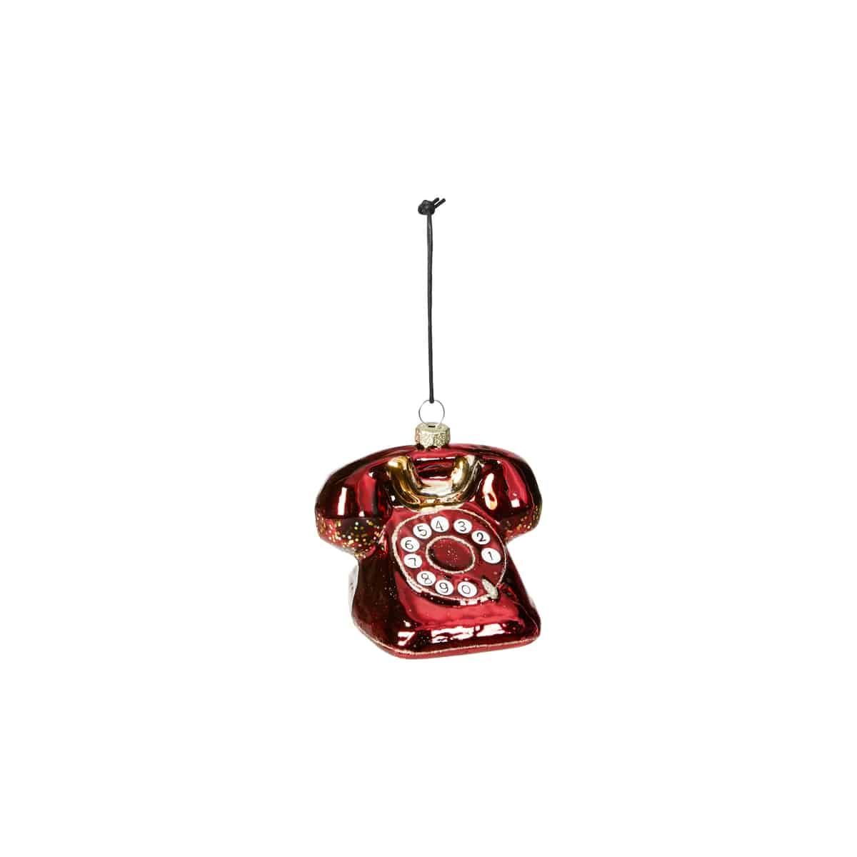 Julekugle formet som en gammeldags telefon med drejeskive. Nostalgisk figurkugle til pynt på fx juletræet. Mål:Længde: 8 cmBredde: 9 cmHøjde: 7 cmFremstillet af glas.Pakket med 1 stk.