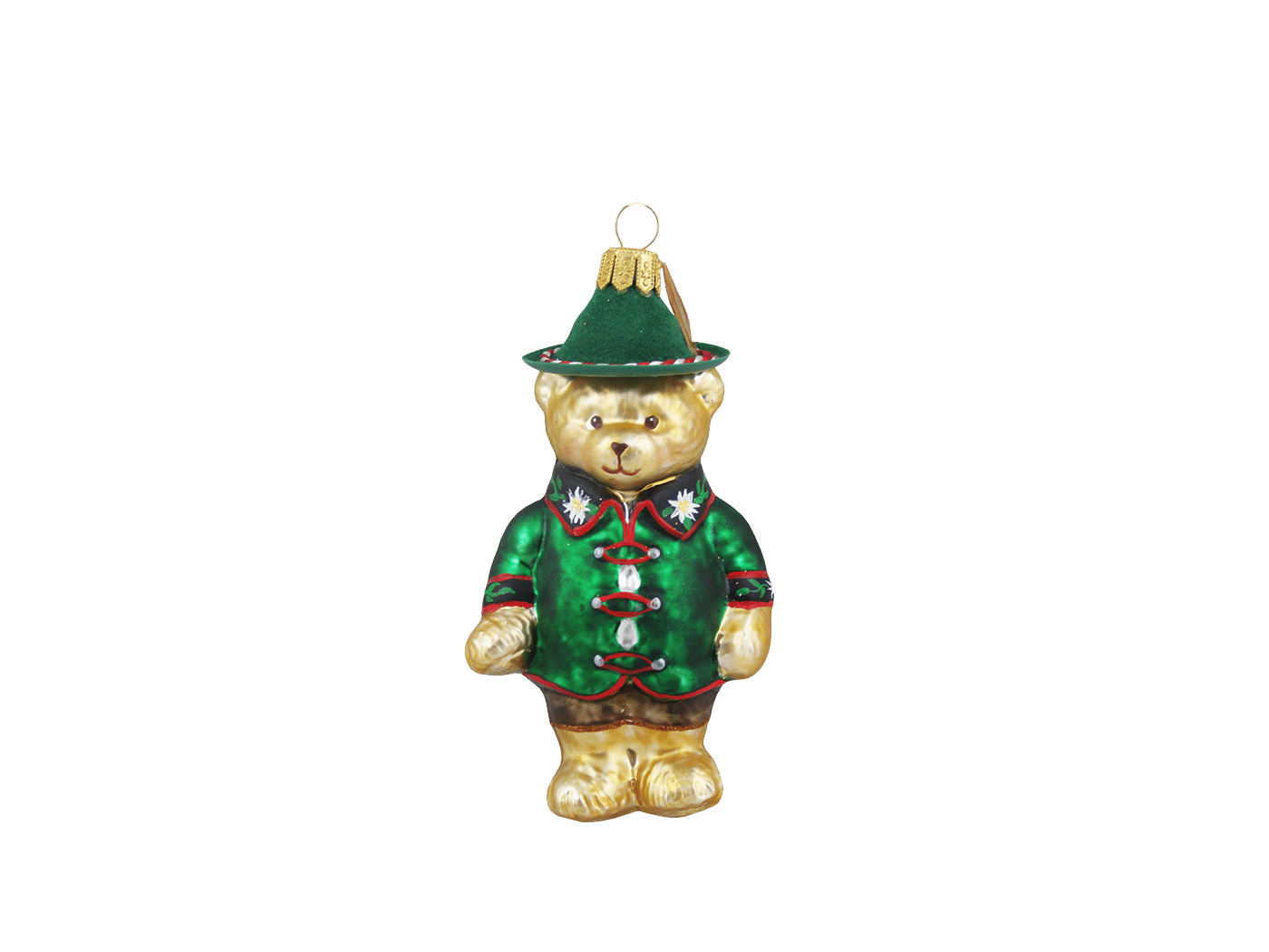Julekugle Tyrolerbjørn er fremstillet i ægte glas fra et østrigsk glaspusteri ved navn Hanco. Stående, tyrolerbamsebjørn med tyrolertøj og tyrolerhat i grønne farver. Tyrolerbjørnen måler 10 cm i højden.Pakket med 1 stk.