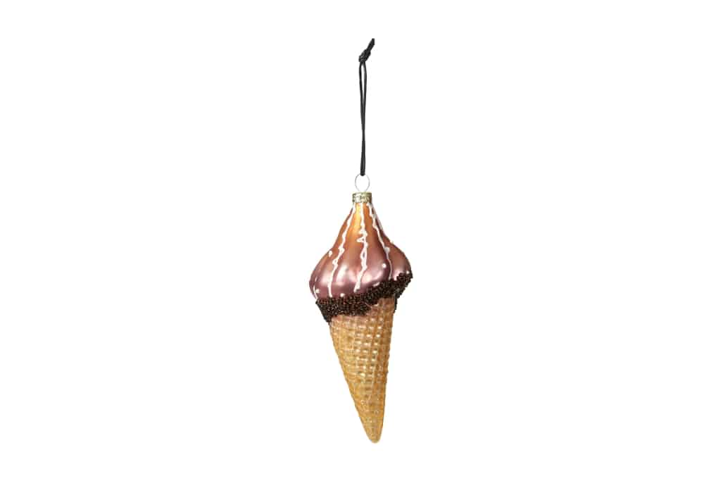 Julekugle formet som vaffelis med lækkeri på toppen i fine nuancer. En sjov og fin figurkugle til pynt på fx juletræet. Mål:Længde: 6 cmBredde: 5,5 cmHøjde: 14 cmFremstillet af glas.Pakket med 1 stk.