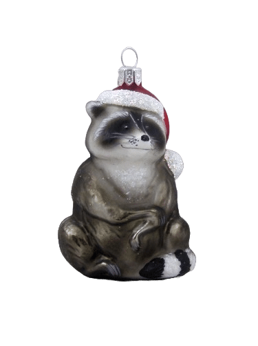 Detaljerig julekugle, der forestiller en siddende vaskebjørn med nissehue på. Julekuglen er mundblæst og håndmalet hos det østrigske glaspusteri Hanco. Figurkugler på grene og juletræer er skønne blikfang mellem de klassiske julekugler.Mål:Højde: 8 cmBred