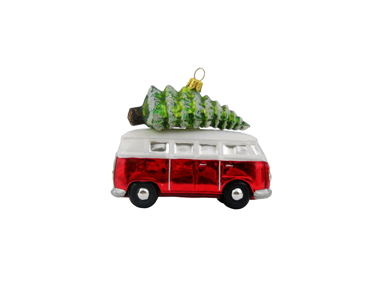 Detaljerig julekugle, der forestiller et folkevognsrugbrød i fin, rød farve og med juletræ på taget. Volkswagen bussen er produceret med licens fra Volkswagen. Julekuglen er mundblæst og håndmalet hos det østrigske glaspusteri Hanco. Figurkugler på grene