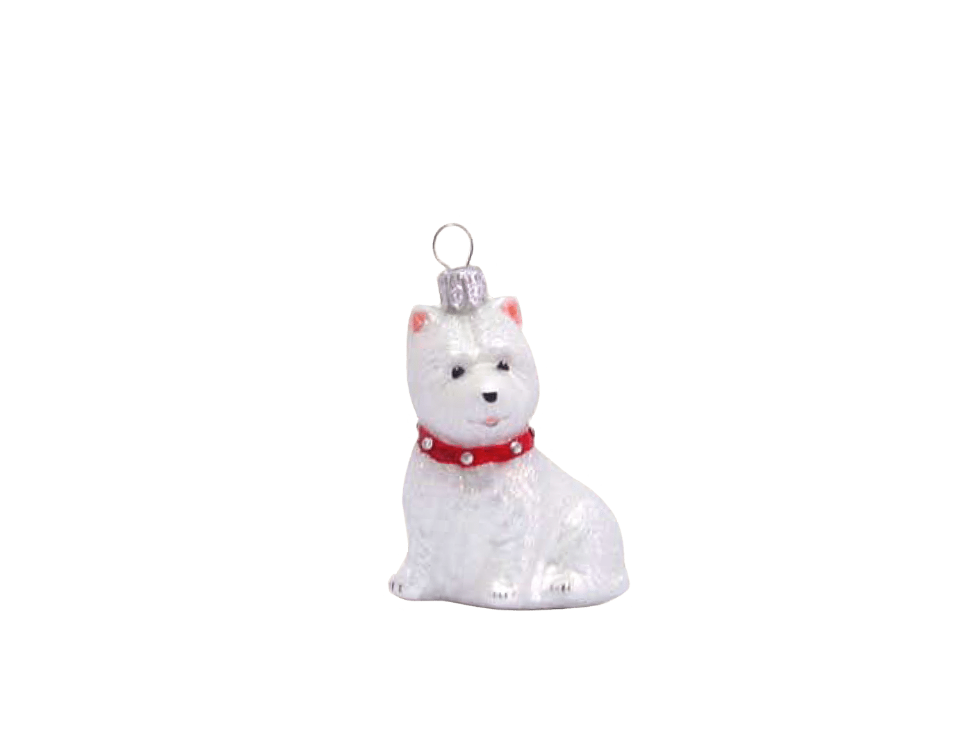 Julekugle West highland white terrier er fremstillet i glas. Den siddende, hvide terrier er med dekorativt rødt halsbånd. Hunden måler 7,8 cm i højden.Pakket med 1 stk.