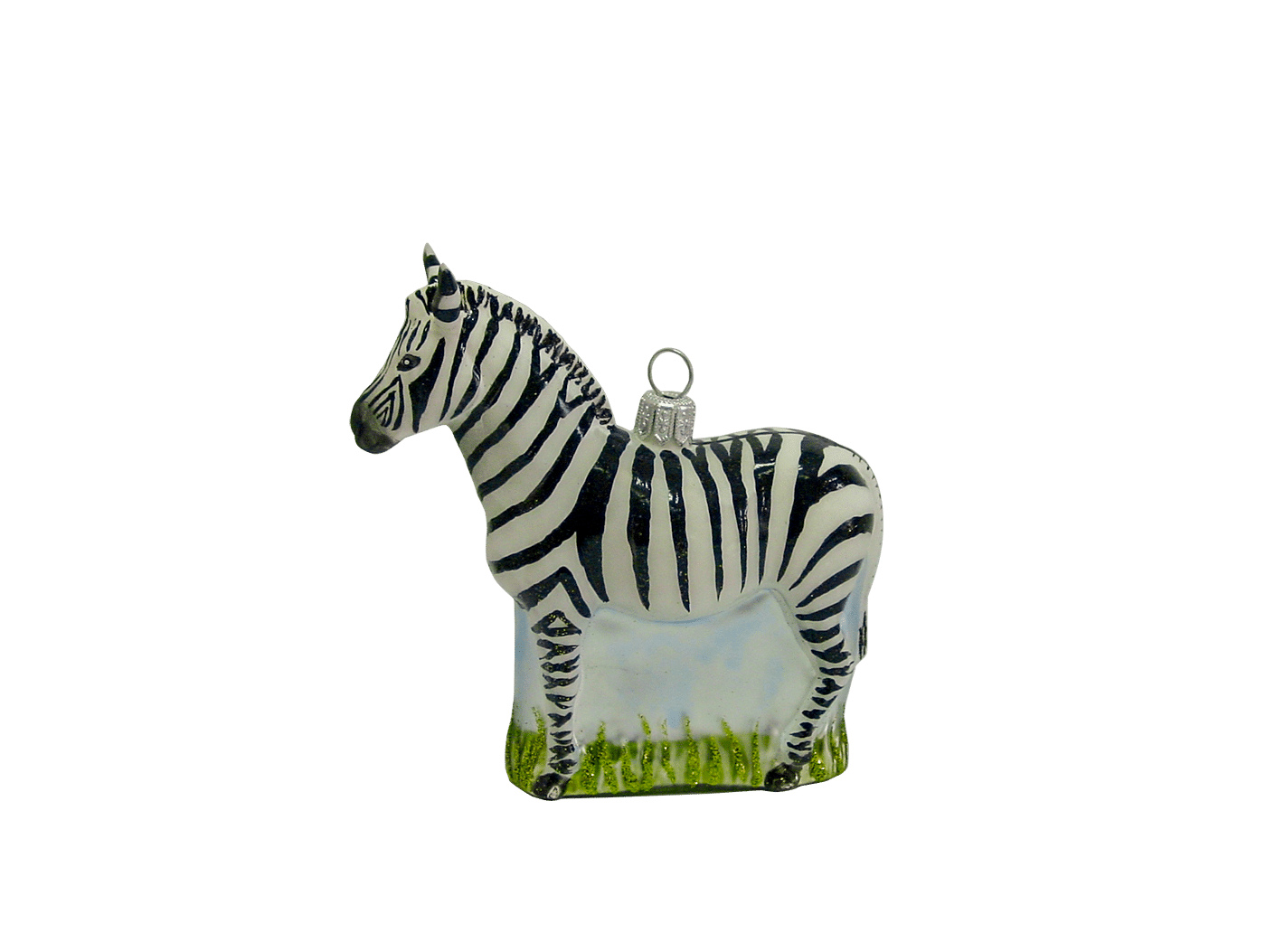 Detaljerig julekugle, der forestiller en zebra. Zebraen er i hvid med sorte striber på hele kroppen også på de små strittende ører. Zebraen står på et lille stykke med højt græs. Julekuglen er mundblæst og håndmalet hos det østrigske glaspusteri Hanco. Fi
