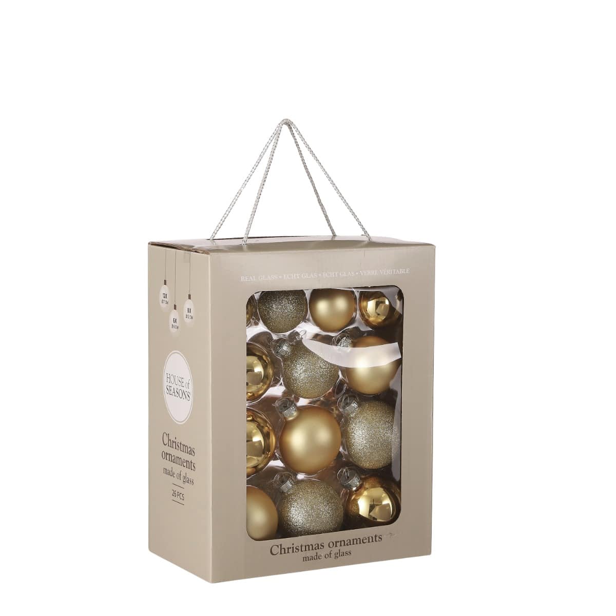 Julekuglerne 26-pak i champagnefarvede nuancer. Julekuglerne findes i 3 varianter: mat, glitter og blank. Julekuglerne i glas pynter smukt i vinduet. Eller pynt juletræet med de 26 julekugler, det giver et elegant og stemningsfuldt udtryk. Kan købes i man