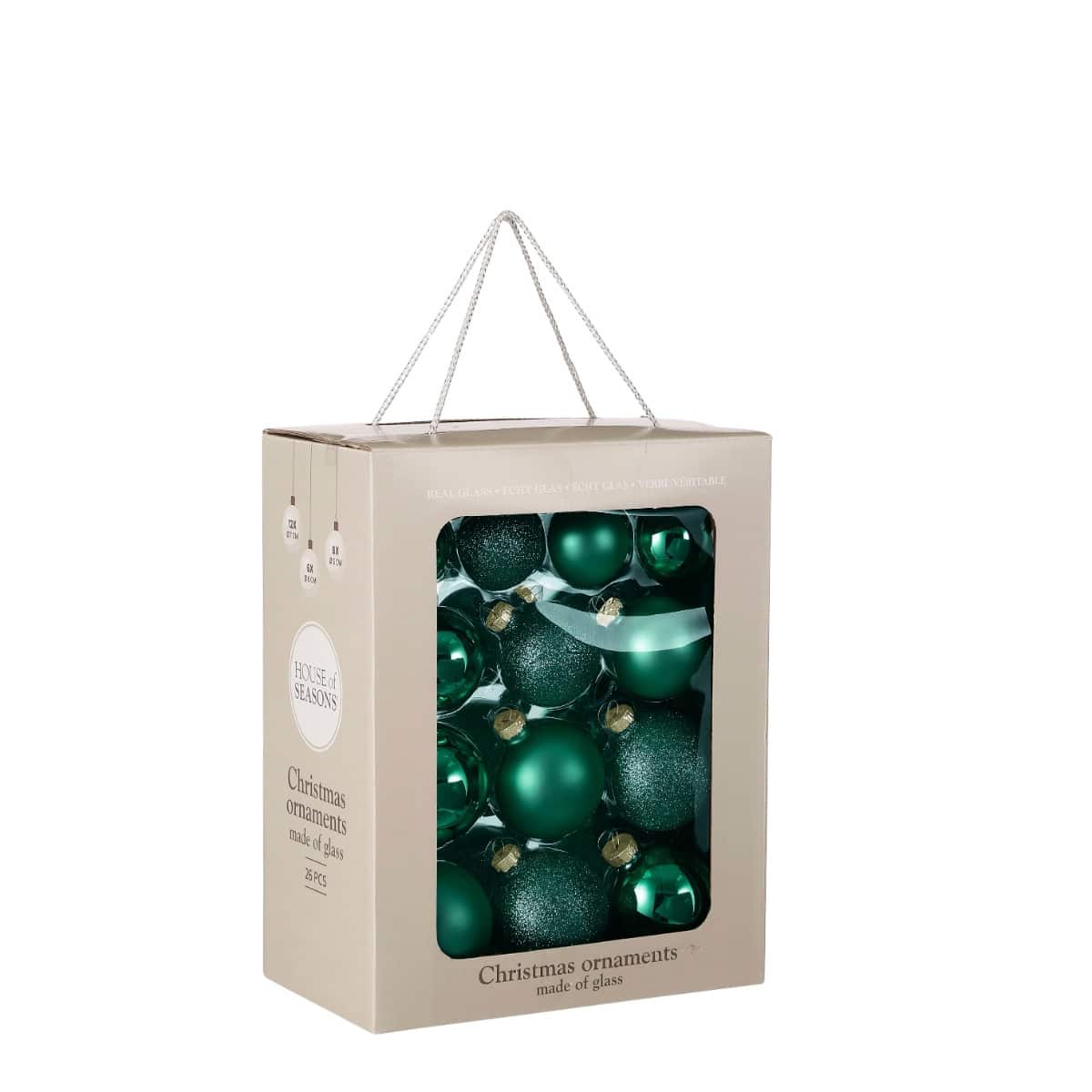 Julekuglerne 26-pak i petroleumsgrøn nuancer. Julekuglerne findes i 3 varianter: mat, glitter og blank. Julekuglerne i glas pynter smukt i vinduet. Eller pynt juletræet med de 26 julekugler, det giver et elegant og stemningsfuldt udtryk. Kan købes i mange