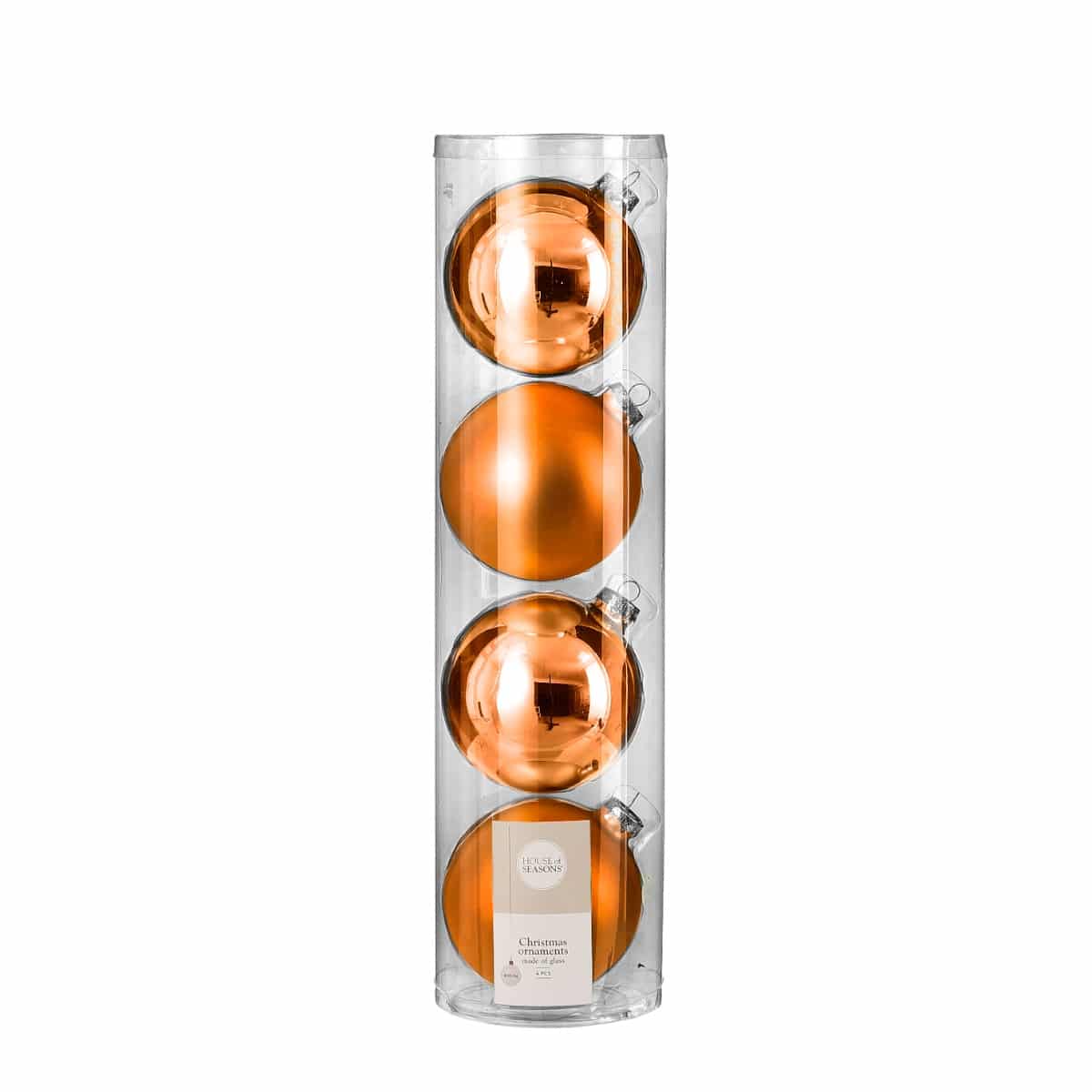 Sæt med 4 stk. julekugler i orange nuancer fremstillet i glas. Indeholder to blanke orange og to matte orange. Mål:Diameter: 10 cm Fremstillet i glasPakken indeholder 4 stk.