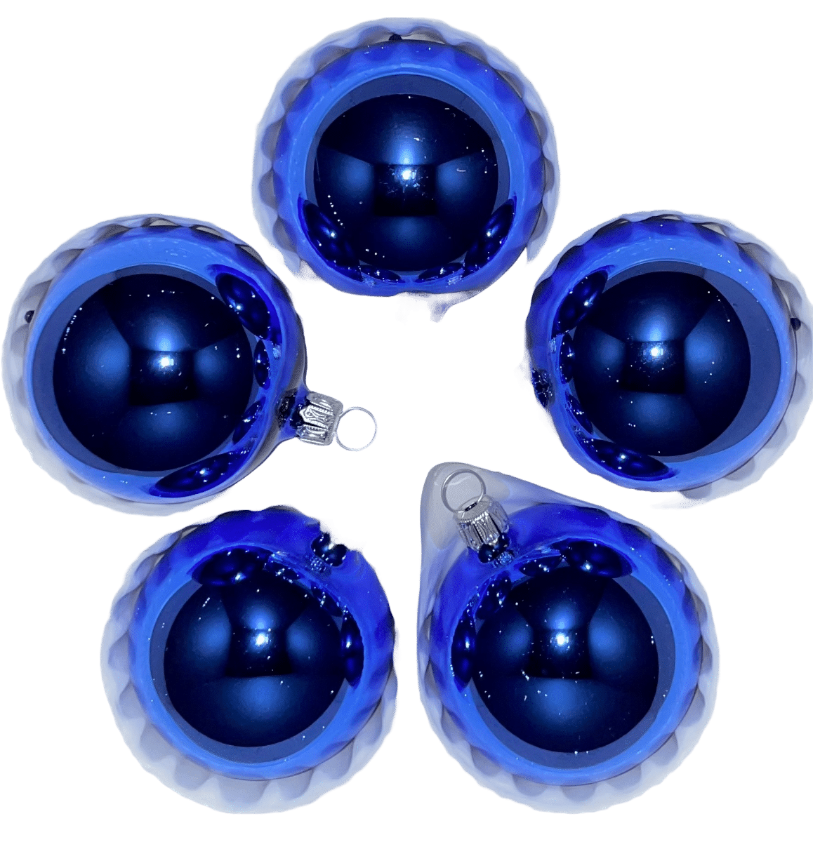 Julekugler i blank blå med en diameter på 6 cm. Julekuglerne er mundblæste, håndmalede og fremstillet i ægte glas hos Glasbläserei Thüringer Weinachten. Pakket med 5 stk. i en æske.