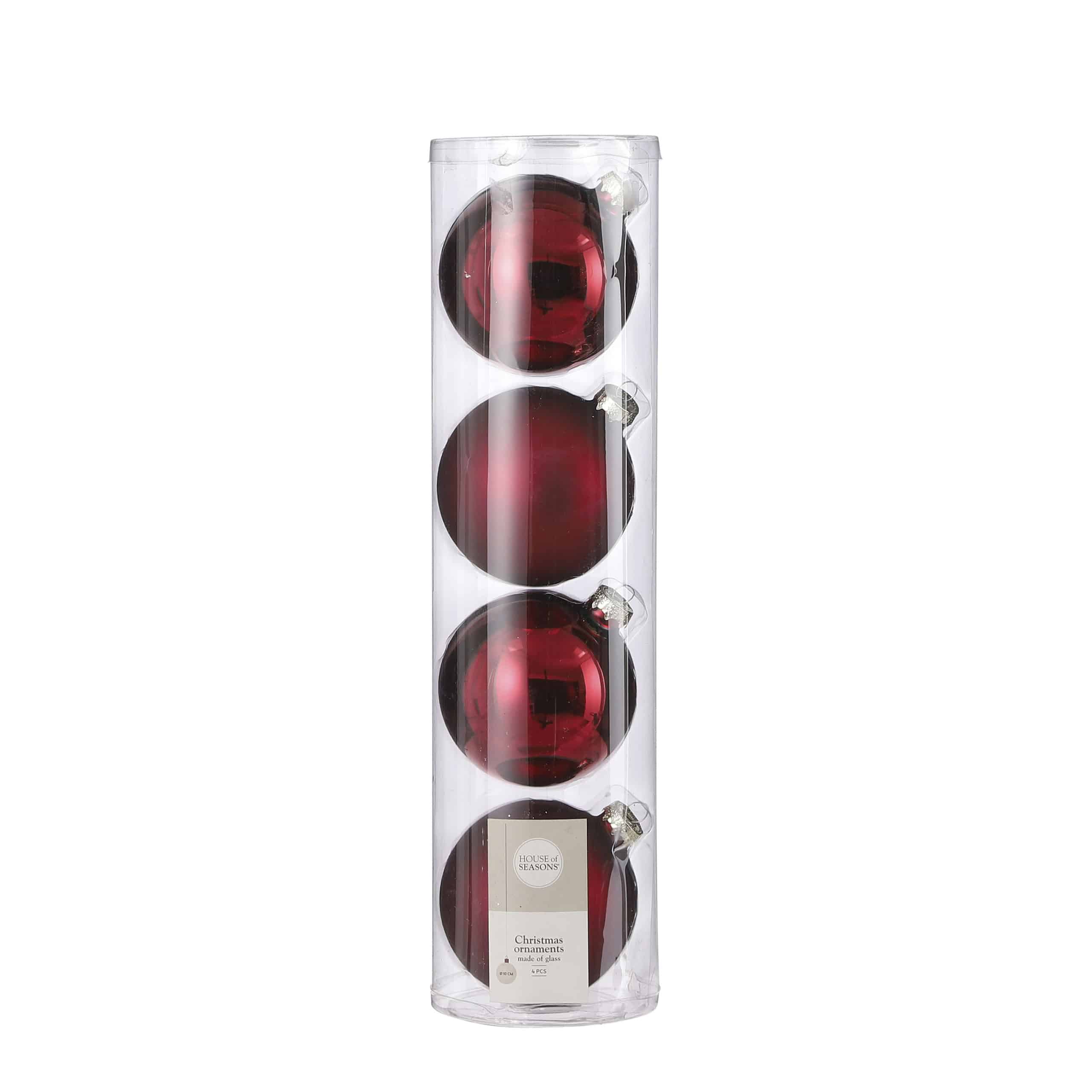 Julekugler i bordeaux i glas. Sættet indeholder to blanke røde og to matte røde juletræskugler. Kuglernes smukke dybe røde farve giver juletræet eller dekorationer et moderne og eksklusivt look. Eller kan anvendes som værtindegave. Mål:Diameter: 10 cm