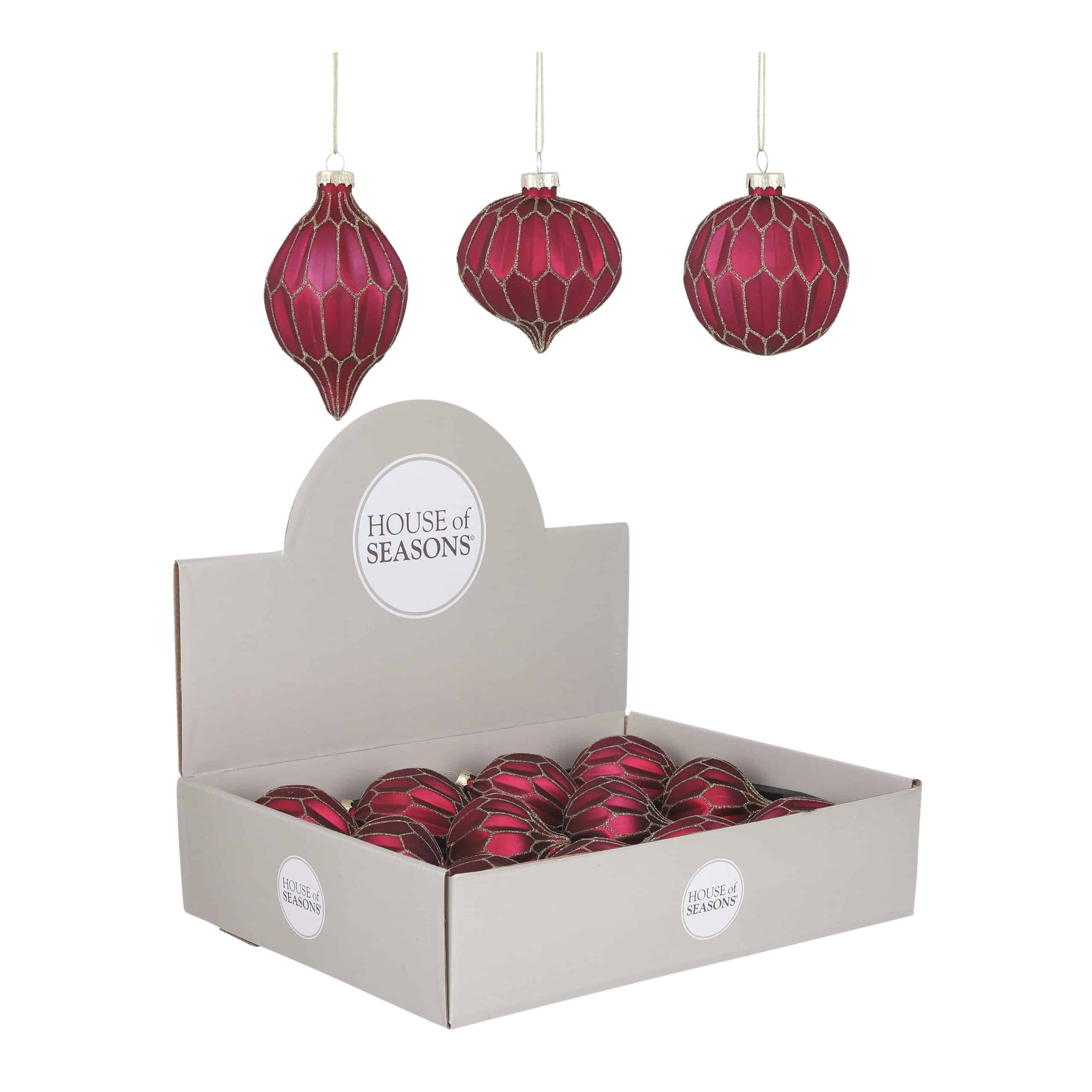 Julekugler bordeauxrøde med guldfarvede aftegninger. Findes i 3 forskellige varianter. Mål:Diameter: 8 cmHøjde: 9 cmFremstillet i glas.Pakket med 1 stk.