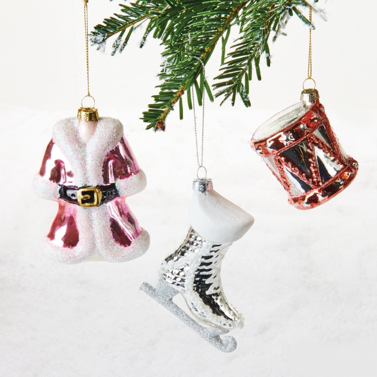 Æske med 3 julekugler formet som en skøjte, en tromme og et julekonekostume. Hyggelige figurkugler, der gør juletræet ekstra festligt. Mål:Højde: ca. 12 cmFremstillet af glas.Pakket med 1 stk.