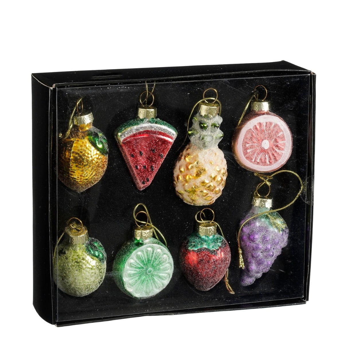 Giv juletræet et legende og farverigt udtryk med disse små julekugler i glas fra Mica Decorations. Julekuglerne er formet som frugter, og serien består af citron, vandmelon, ananas, figen, vindrueklase, jordbær og lime alle med en mat, snedrysset overflad