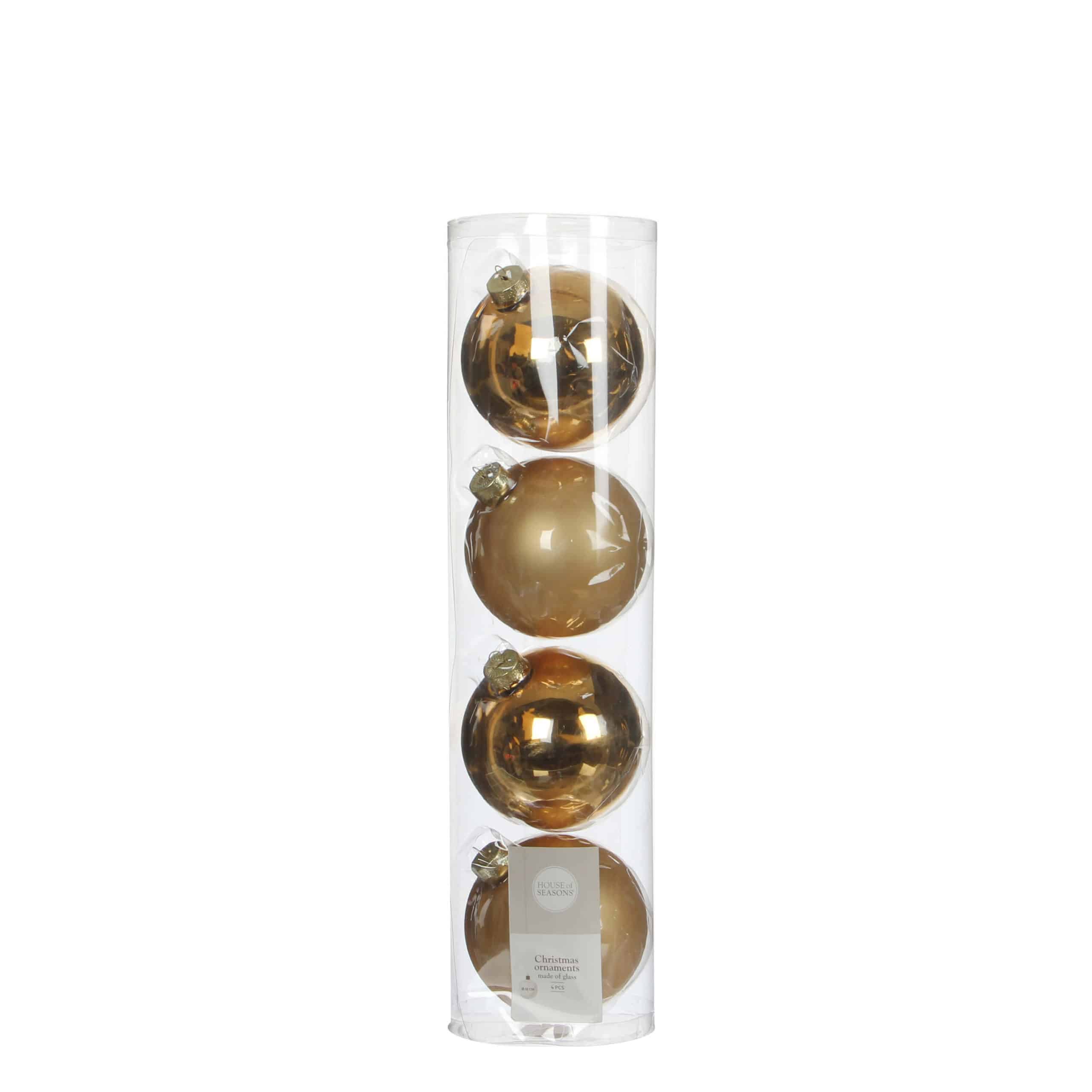 Julekugler 4-pak i guld i glas. Sættet består af to blanke og to matte juletræskugler. Den varme glød i de gyldne kugler skaber julemagi både på juletræet og i andre vinterdekorationer. De kan også anvendes som en smuk værtindegave. Mål:Diameter: 10 cm