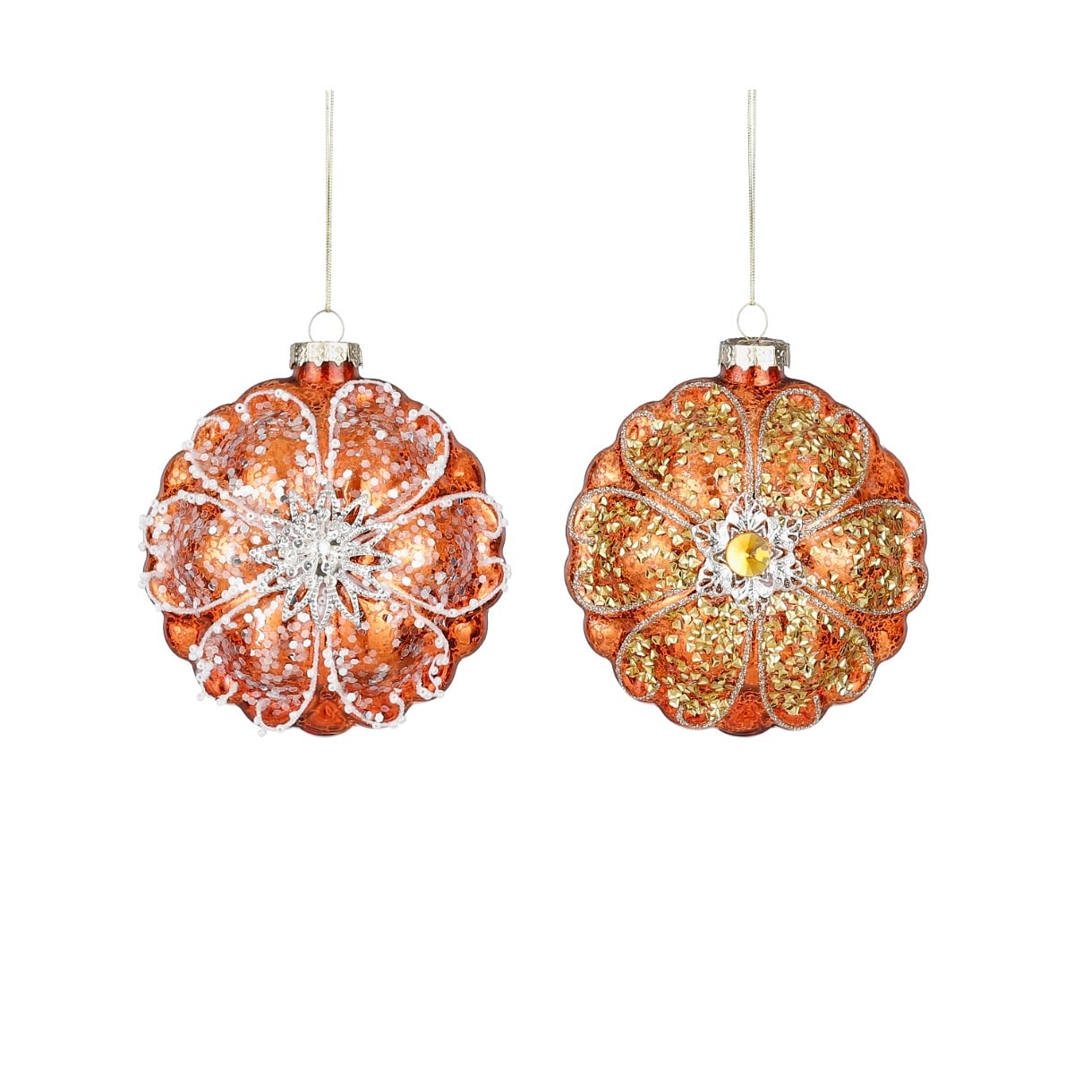 Julekugler med blomsterhovedform og hjerteformet bladmønster som pynt. Julekuglerne er i en flot orange farve og findes i to varianter med enten sølvfarvet eller guldfarvet pynt på. Mål:Bredde: 5,5 cmHøjde: 10 cmFremstillet i glas.Pakket med 1 stk.