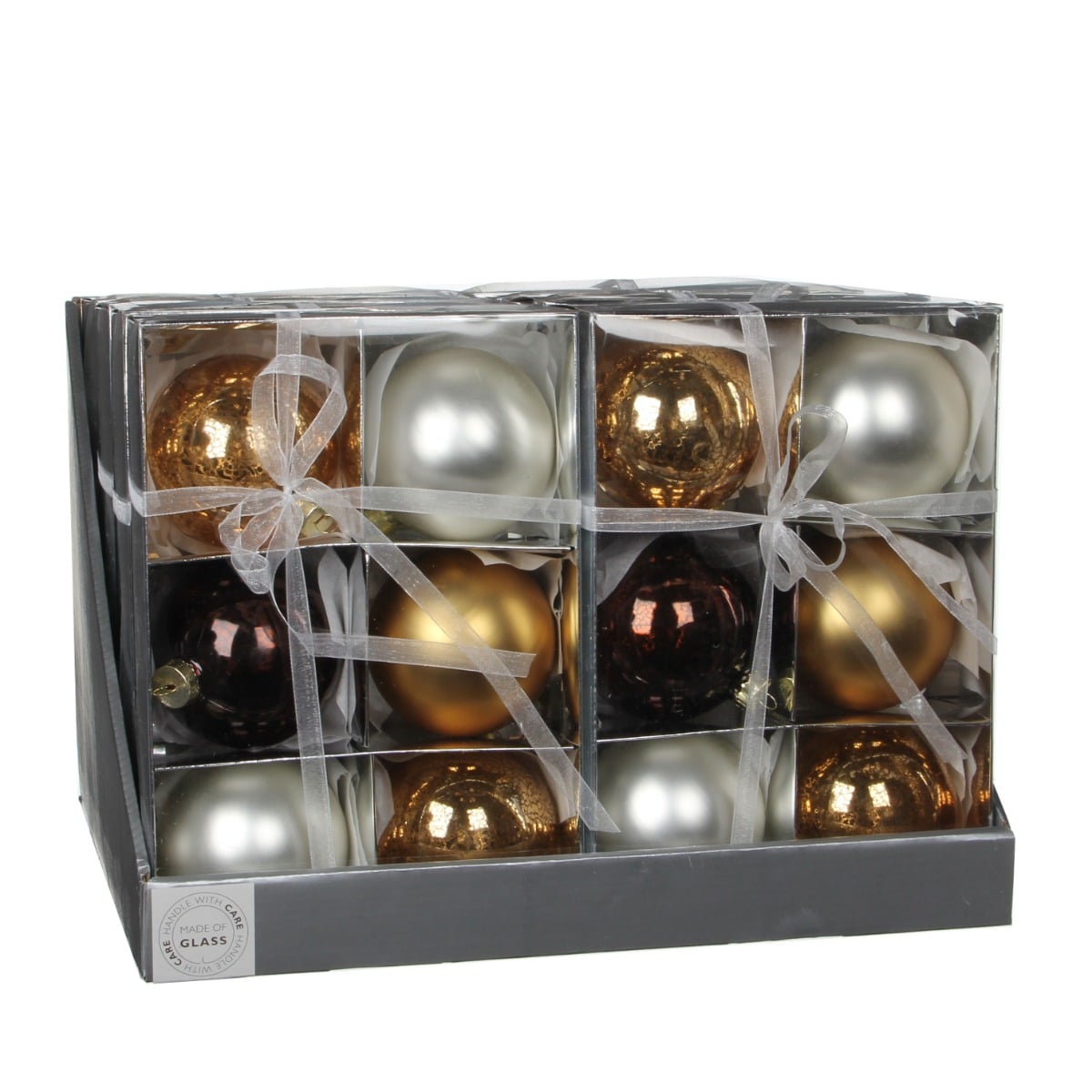 Julekugler i 6-pak. I æsken er der følgende julekugler: 2 x guldfarvede julekugler med krakeleret mønster, 1 x kobberbrun med krakeleret mønster, 1 x mat guld samt 2 x matte sølvhvide. Det krakelerede mønster giver et eksklusivt, poetisk udtryk til juletr
