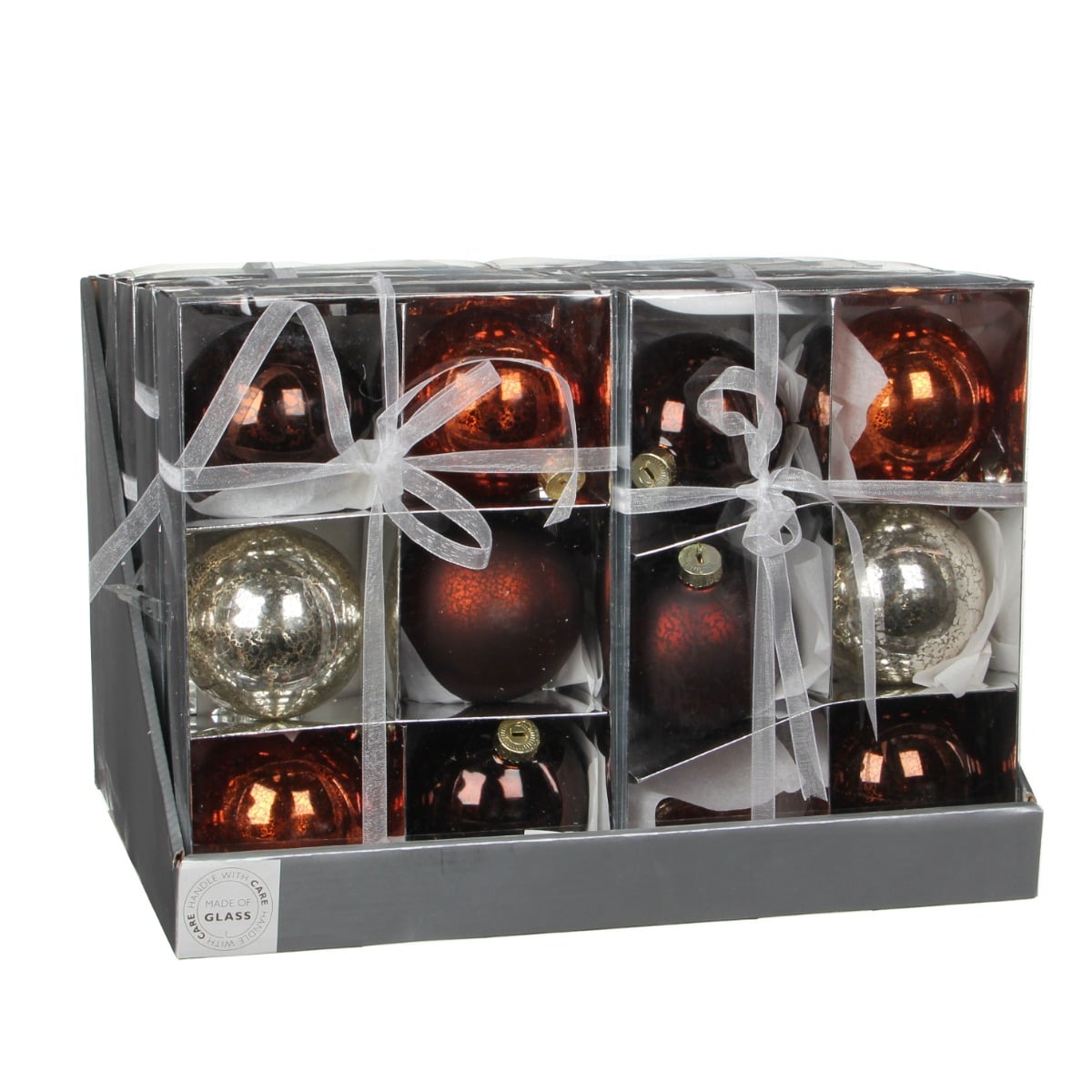 Julekugler i 6 pak. I æsken er der følgende julekugler: 2 x brune med krakeleret mønster, 1 x sølvhvid med krakeleret mønster, 1 x mat kobberbrun med krakeleret mønster samt 2 x kobberrøde med krakeleret mønster. Det krakelerede mønster i varme farver giv