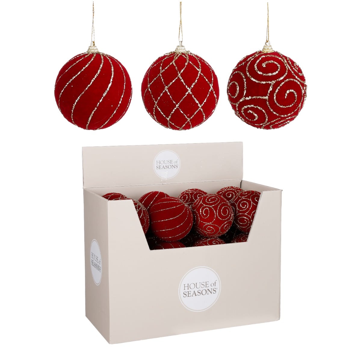 Julekugler i flamingo med rød, velouragtig, blød overflade og fint guldfarvet mønster. Findes i tre forskellige mønstervarianter. Gode til at hænge på udsatte steder, da de tåler lidt af hvert. Mål:Diameter: 10 cmFremstillet i flamingo.Pakket med 1 stk.