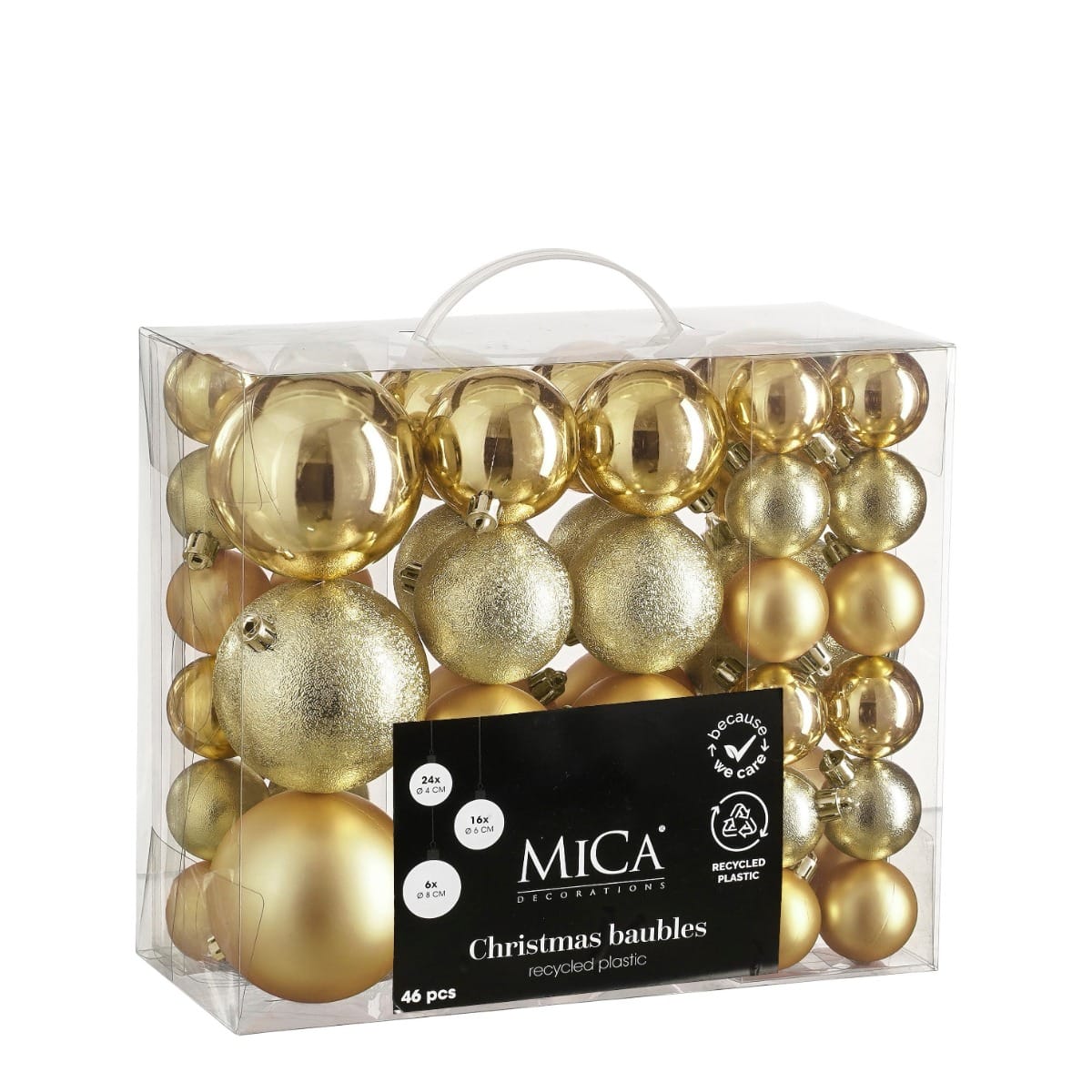 Dette er et sæt bestående af 6 varianter af julekugler i guldfarvede nuancer i 3 forskellige størrelser med en diameter op til 8 cm. Julekuglerne er desuden i matte, blanke eller med glimmer på. Mål:24 julekugler med en diameter på 4 cm16 julekugler med e