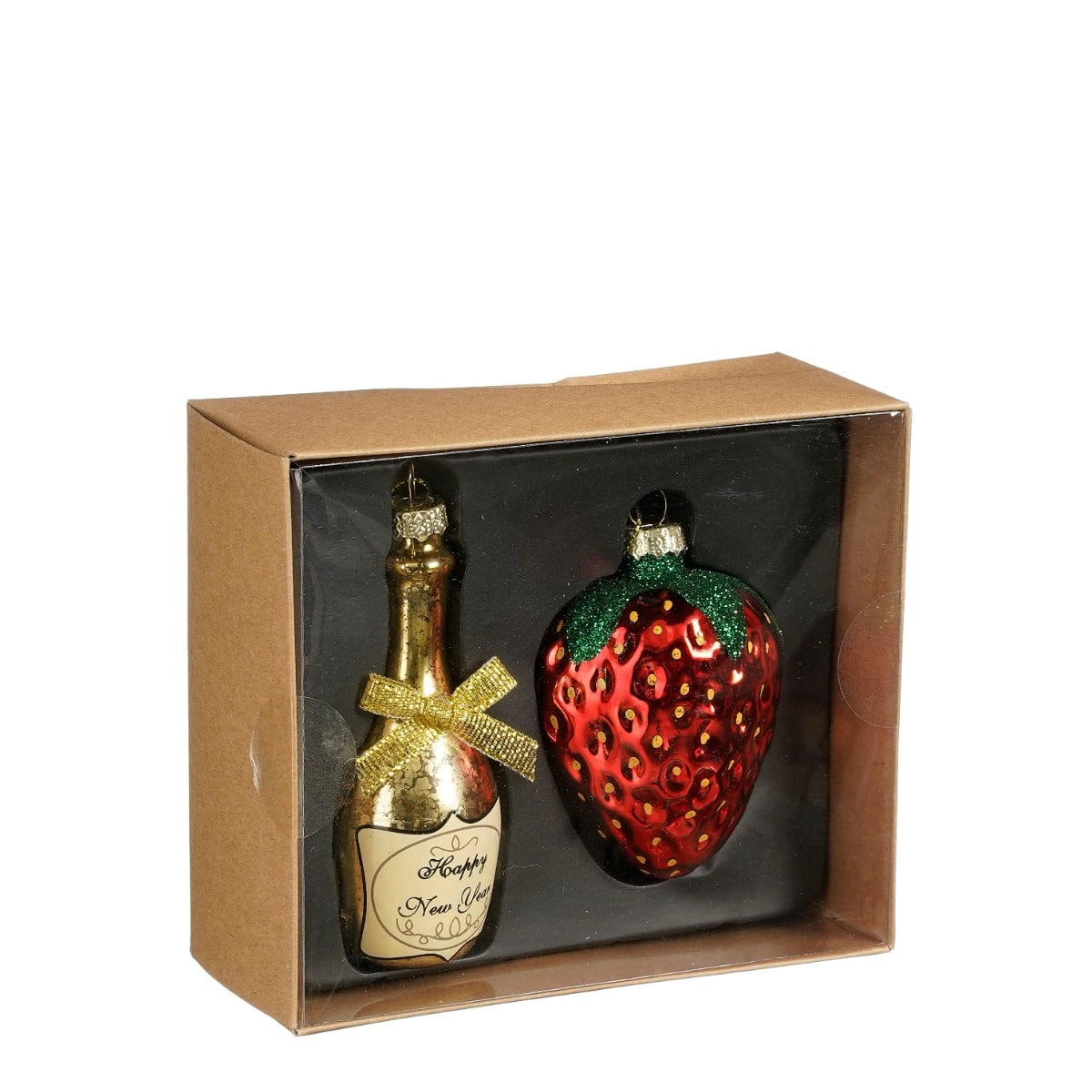 Julekugler i sæt med temaet champagne. I æsken finder du en champagneflaske og et jordbær. Fine som pynt på juletræet eller en sød gaveidé.Mål: (på æsken, de ligger i)Længde: 14 cmBredde: 12 cmHøjde: 5,5 cmFremstillet af glas.Pakket med 1 sæt.