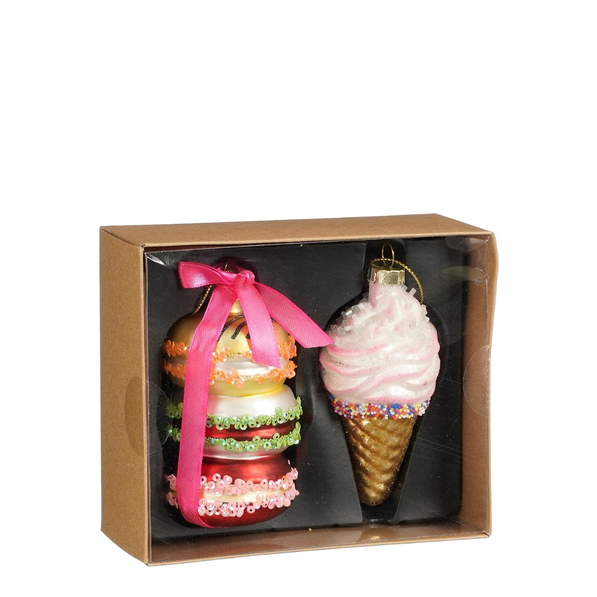 Julekugler i sæt med temaet is og kage. I æsken finder du en stabel macarons og en isvaffel. Fine som pynt på juletræet eller en sød gaveidé.Mål: (på æsken, de ligger i)Længde: 14 cmBredde: 12 cmHøjde: 5,5 cmFremstillet af glas.Pakket med 1 sæt.