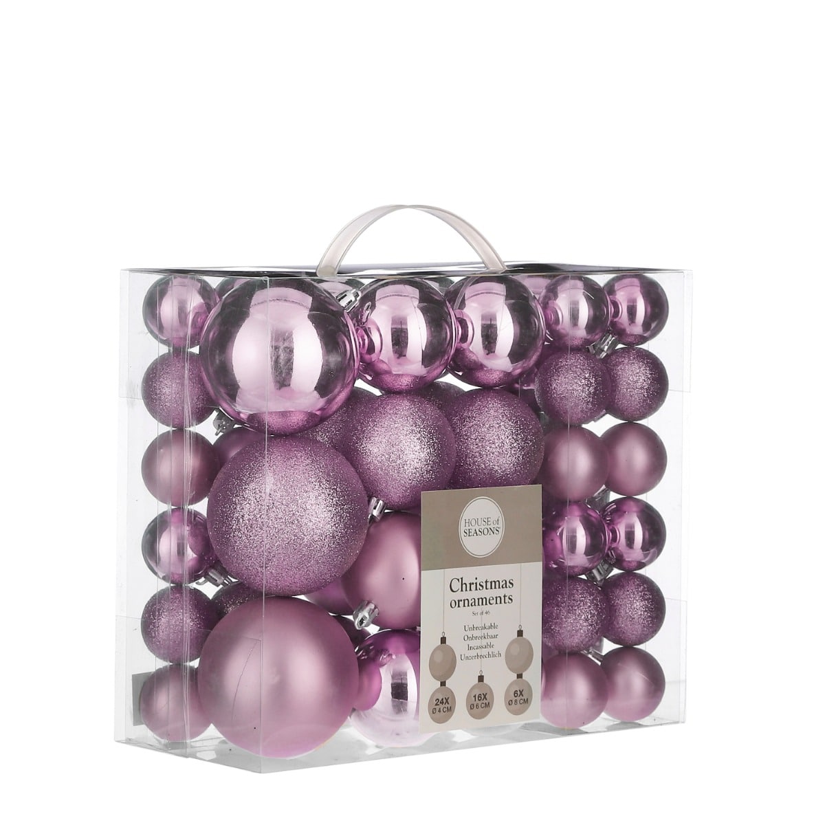 Dette er et sæt bestående af 6 varianter af julekugler i en fin lilla farve i 3 forskellige størrelser med en diameter op til 8 cm. Julekuglerne er desuden i matte, blanke eller med glimmer på. Mål:24 julekugler med en diameter på 4 cm16 julekugler med en