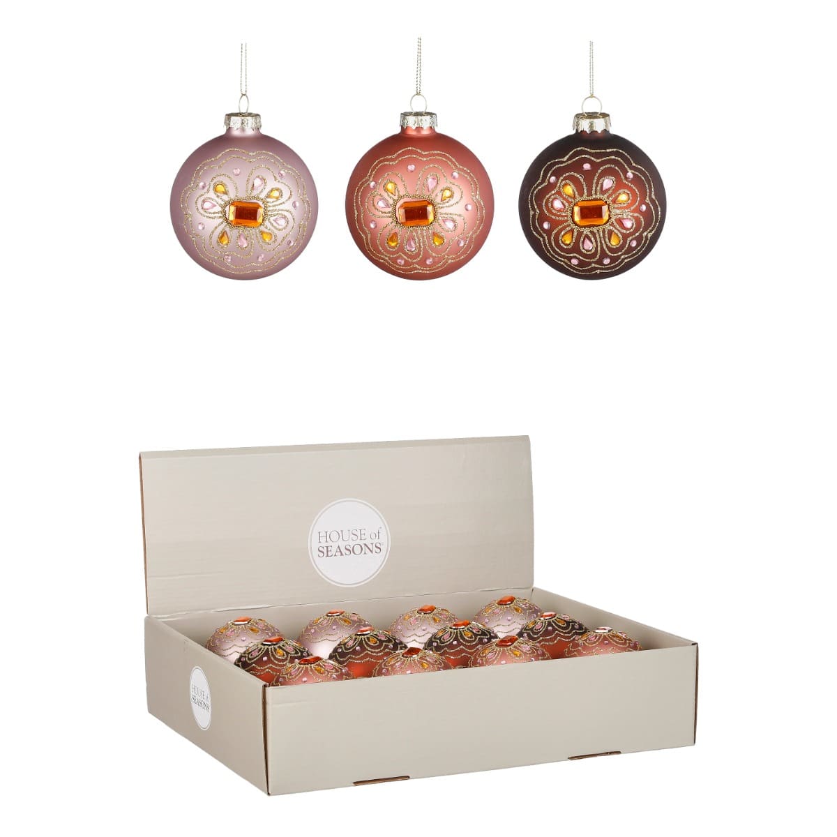Matte julekugler med glimtende sten og mønster i trendy 2022 farver. Vælg mellem lilla, brun og orange. Mål:Diameter: 8 cmFremstillet i glas.Pakket med 1 stk.