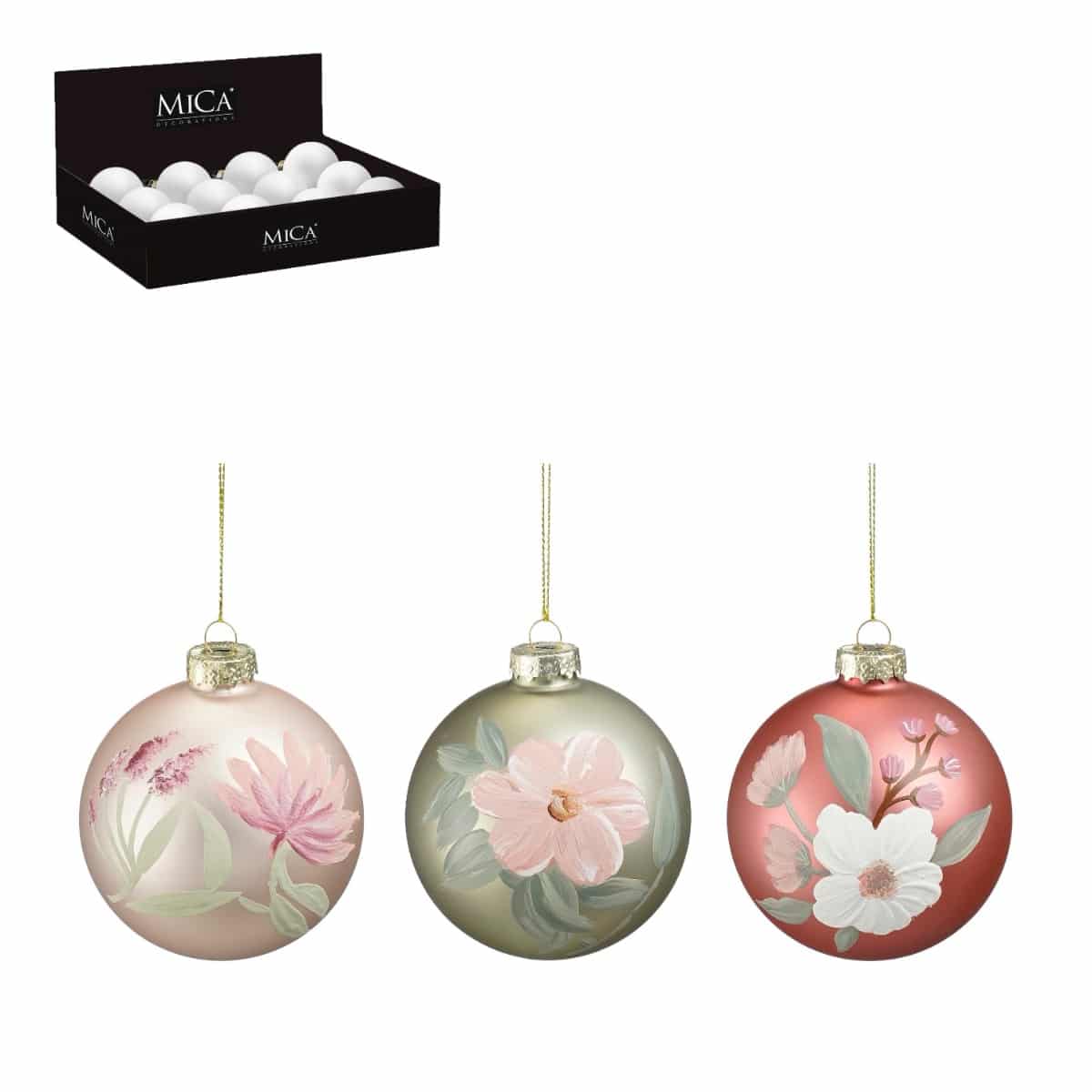 Pynt juletræet med disse julekugler i glas i matte pastelfarver. Kuglerne er dekoreret med smukke, malede blomstermotiver, som giver et romantisk og dekorativt udtryk, der passer perfekt til både klassisk og moderne juleindretning. Farverne i serien er ly