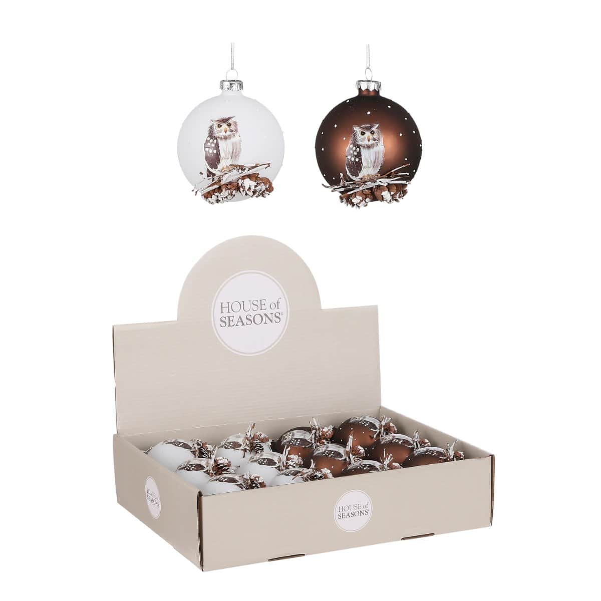 Julekugle i hvid eller brun, mat farve med snefnugsprikker og med ugle som motiv. Uglen sidder på en dekoration af småkviste og kogler, der giver en 3D-effekt. Mål:Diameter: 8 cmFremstillet i glas.Pakket med 1 stk.
