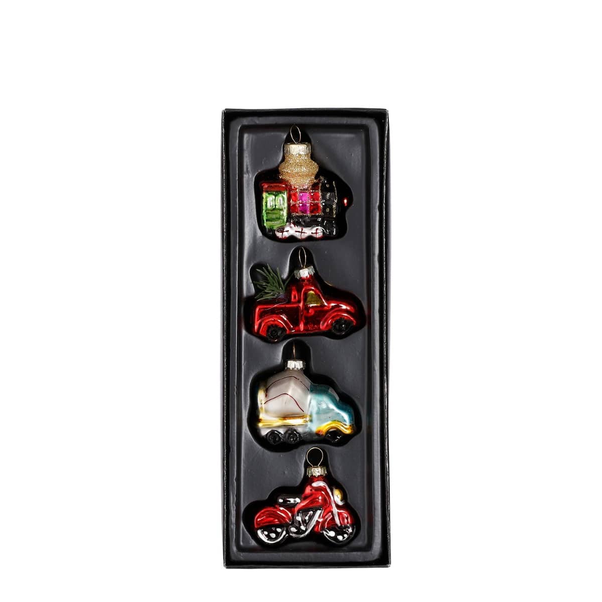 Æske med 4 figurjulekugler i lille størrelse. Der er et tog, en motorcykel, en betonblander og en pick up i æsken. De måler omkring 5 cm i højden. Fine til det mindre juletræ eller på grangrene. Mål:Højde: 5 cm Fremstillet af glasPakket med 1 æske
