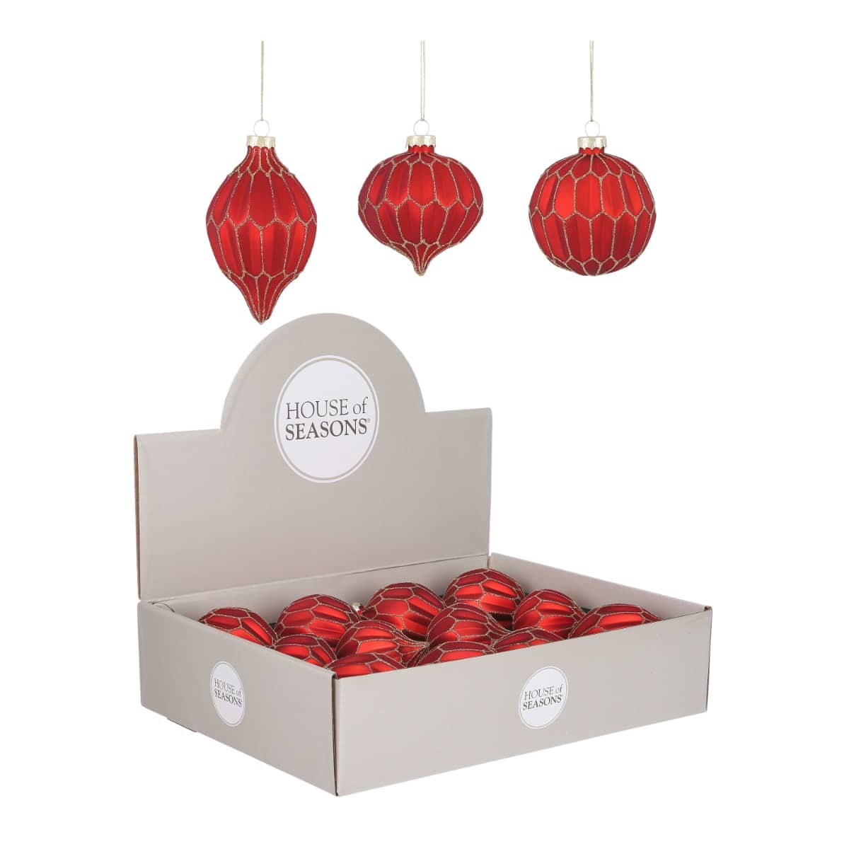 Julekugler med rustikt mønter indrammet med tynd guldglitter. Julekuglen fås i 3 forskellige former. Pynter flot på juletræet, men er også fine som bordpynt. Mål:Diameter: 8 cmHøjde: 9 cmFremstillet af glas.Pakket med 1 stk.